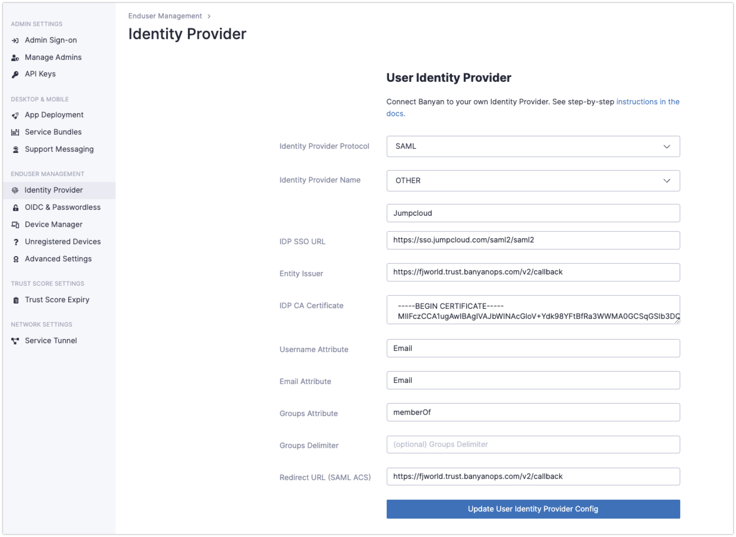 1) IdP Entity ID: https://{ORGNAME}.trust.banyanops.com/v2/callback