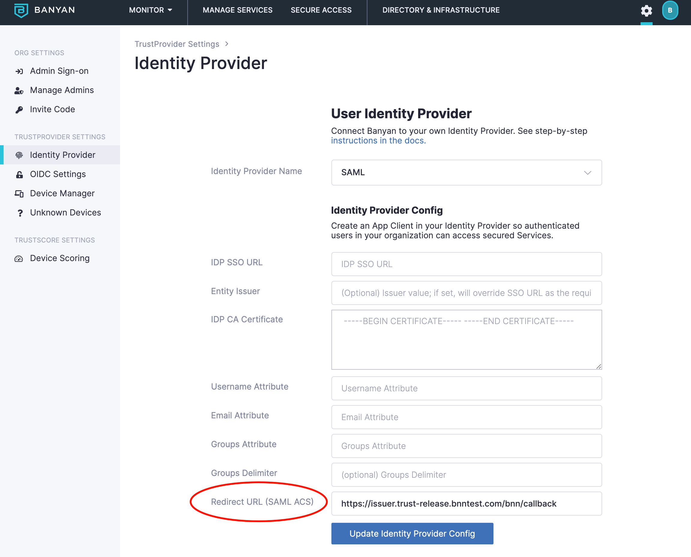 6.1 Return to the Identity Provider page in the Command Center (Settings > Identity and Access tab > End User tab) and enter the Banyan TrustProvider App parameters from your SAML IDP: