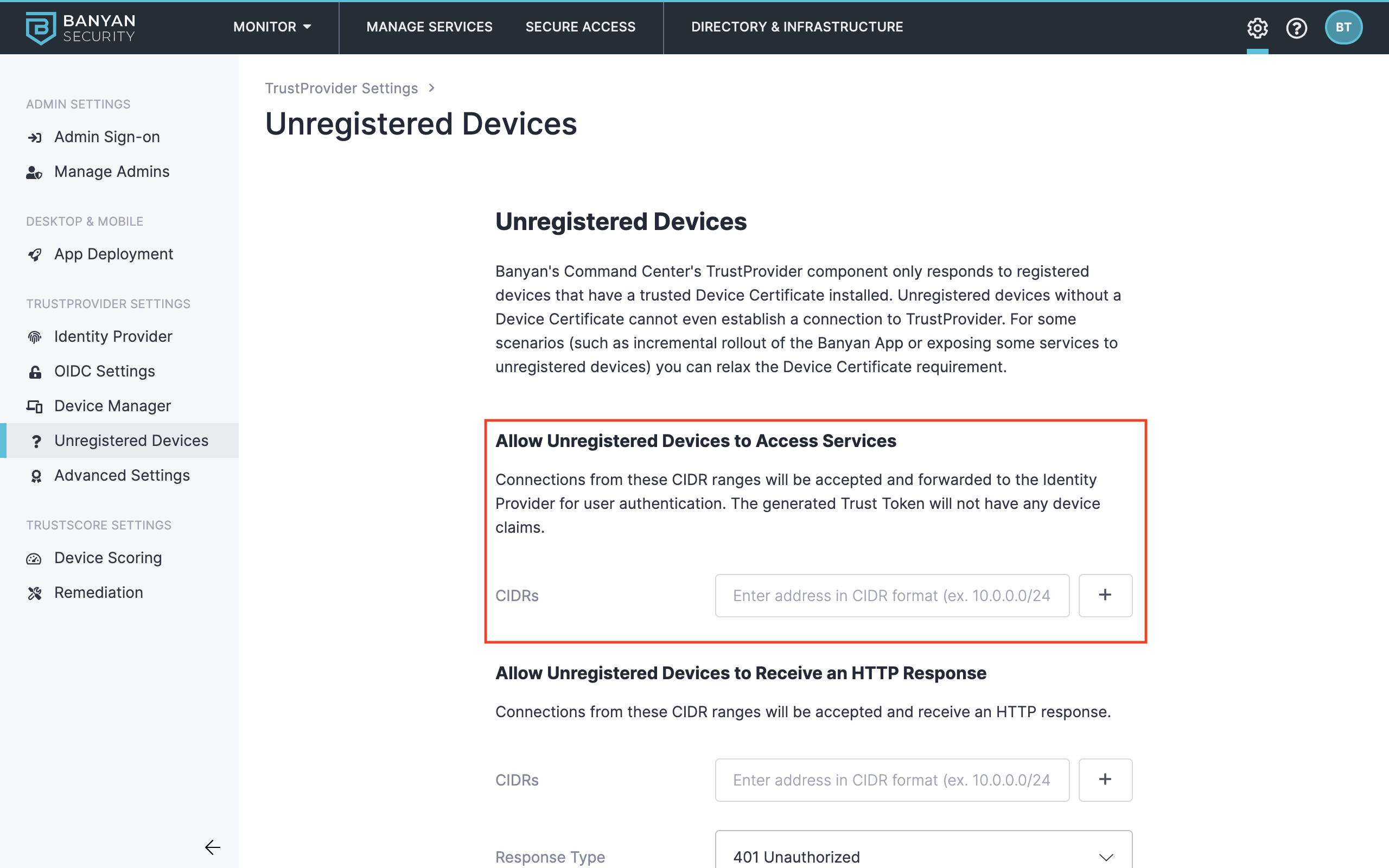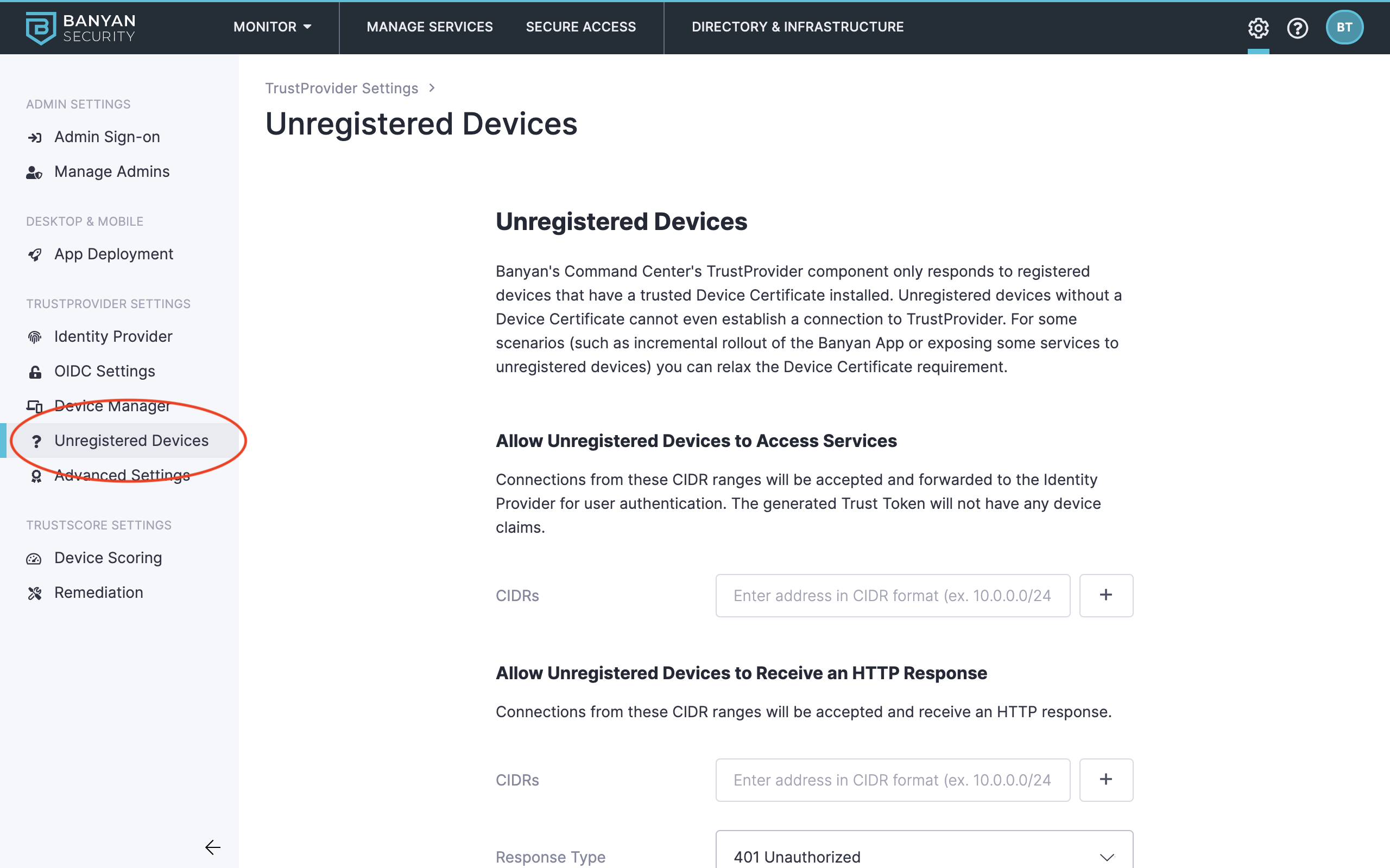 Registered and Unregistered device access is managed in the Command Center, both at the organization level and at the service level.