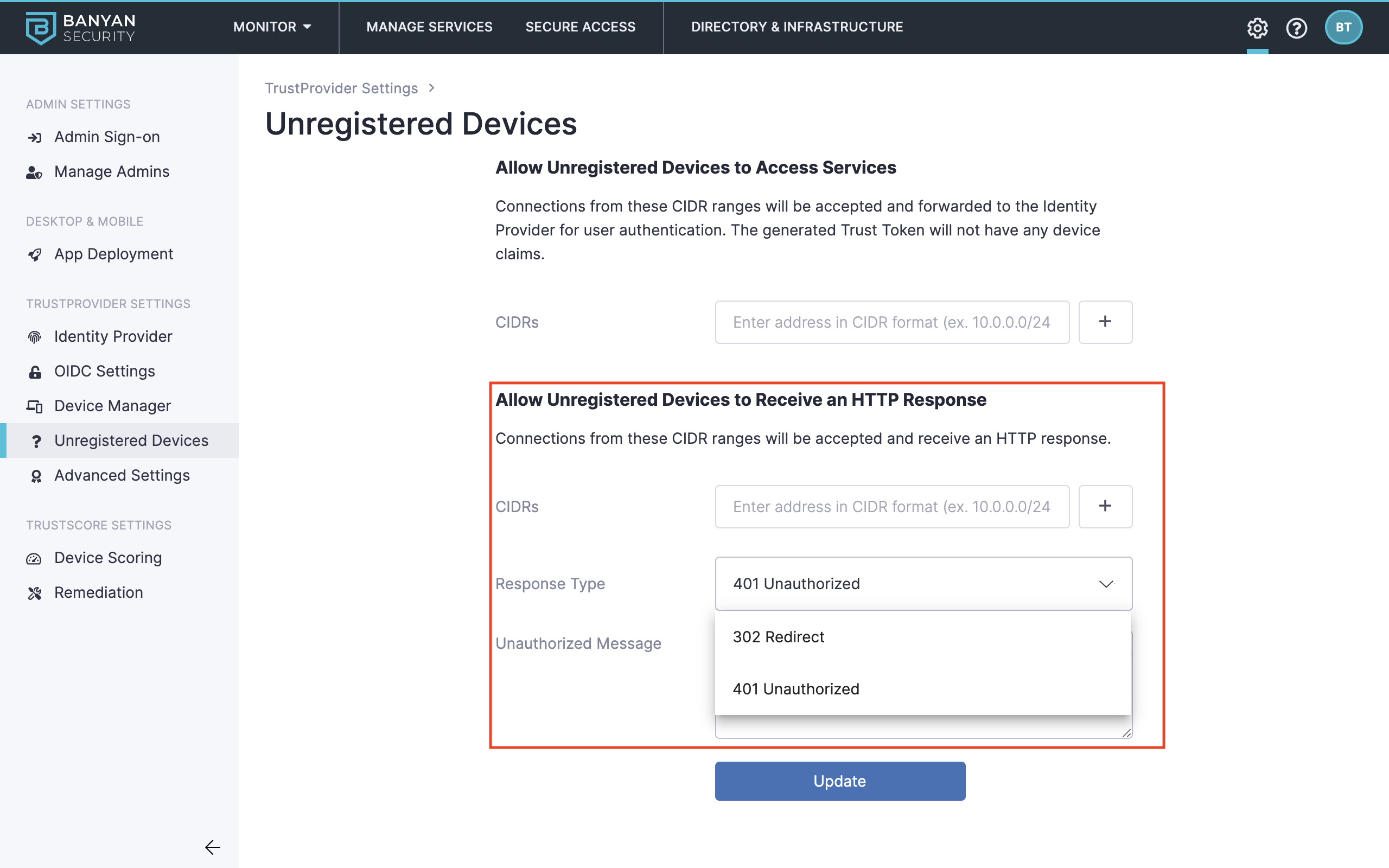 The Allow Unregistered Devices to Receive an HTTP Response section allows you to customize either a: