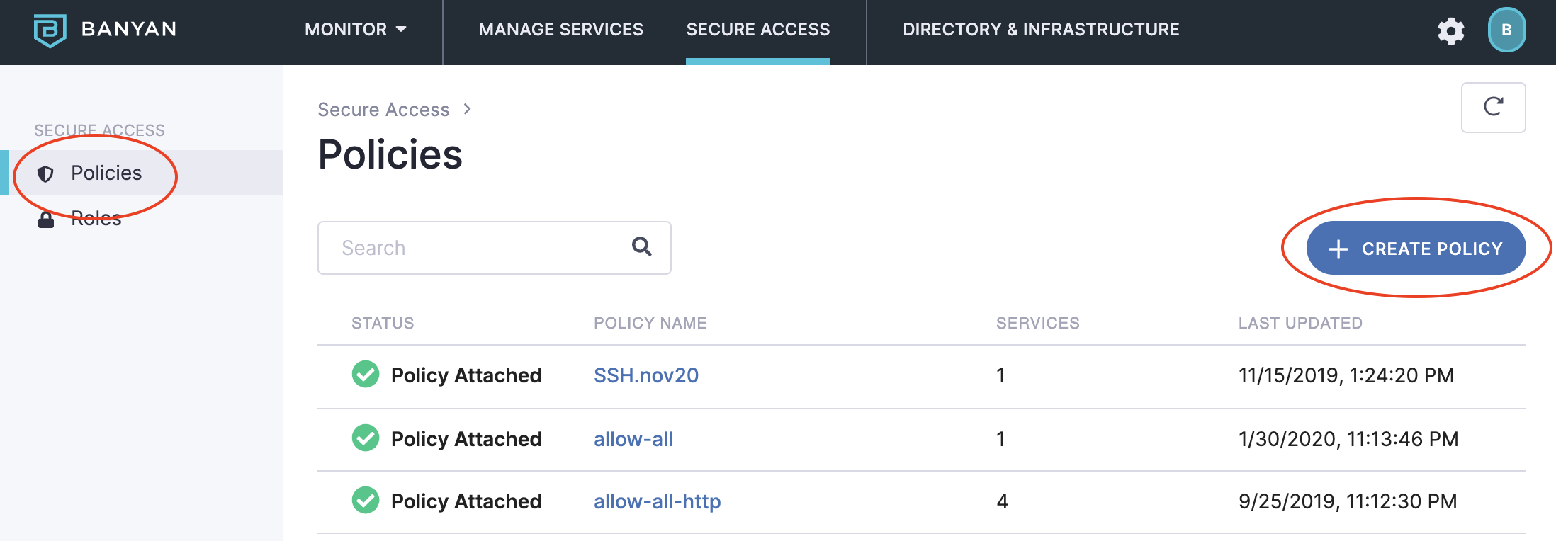 - Navigate to Secure Access > Policies and then click + Create Policy.