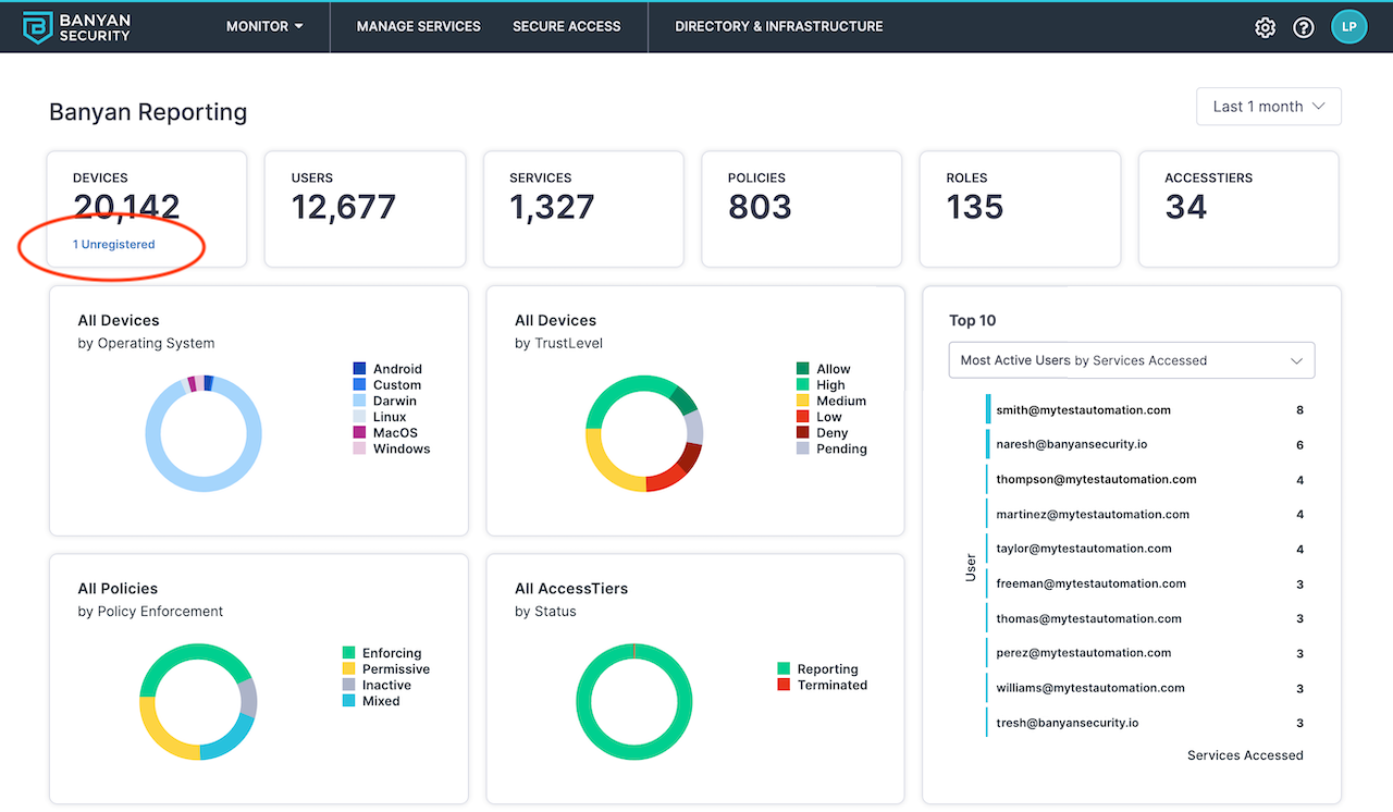 Additionally, the Command Center lists your organization’s unregistered devices on the Directory & Infrastructure page and displays a count of them on the Reporting page.