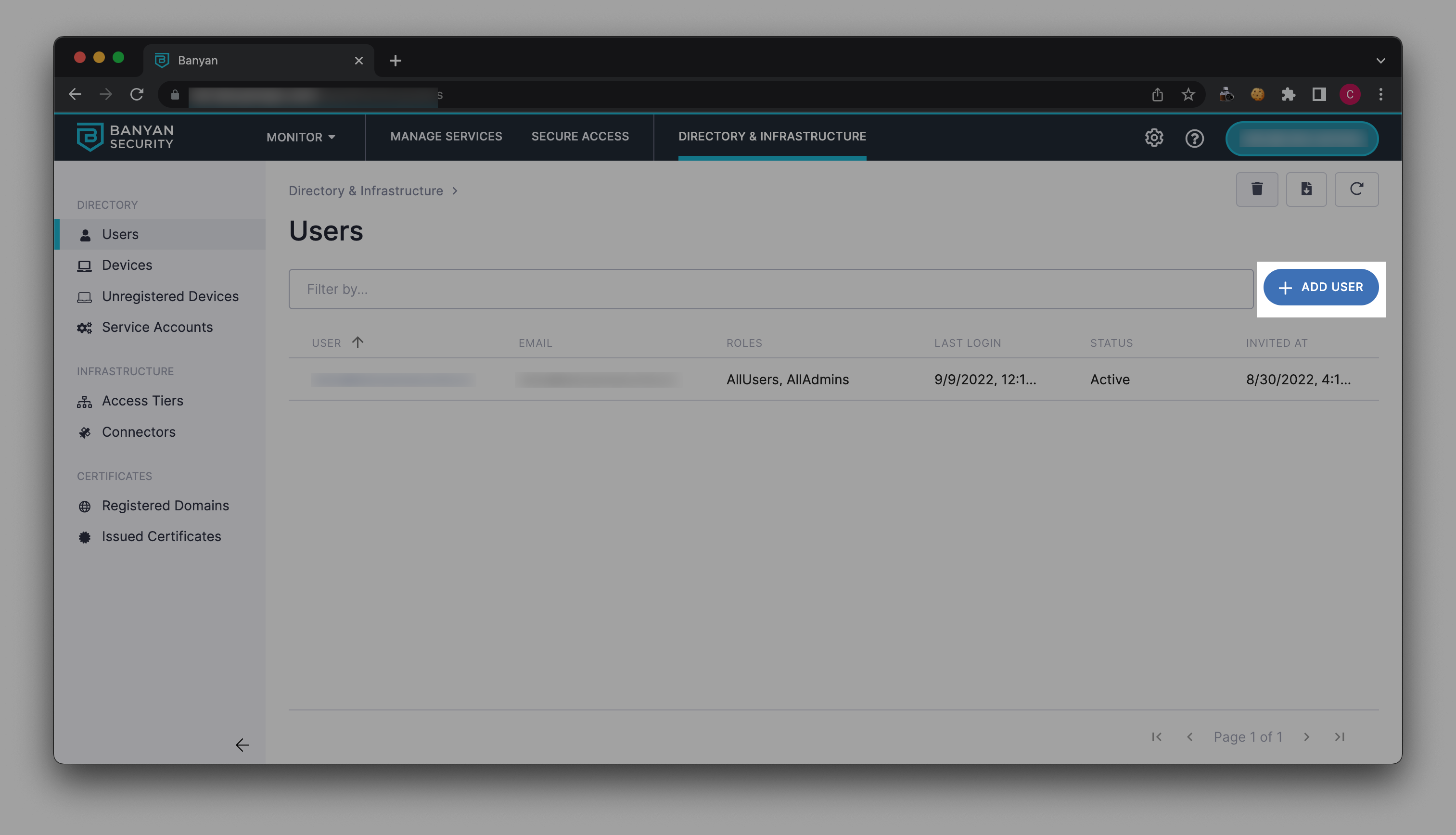 7.1 In Banyan’s Command Center, navigate from Directory & Infrastructure > Users, and select Add User.