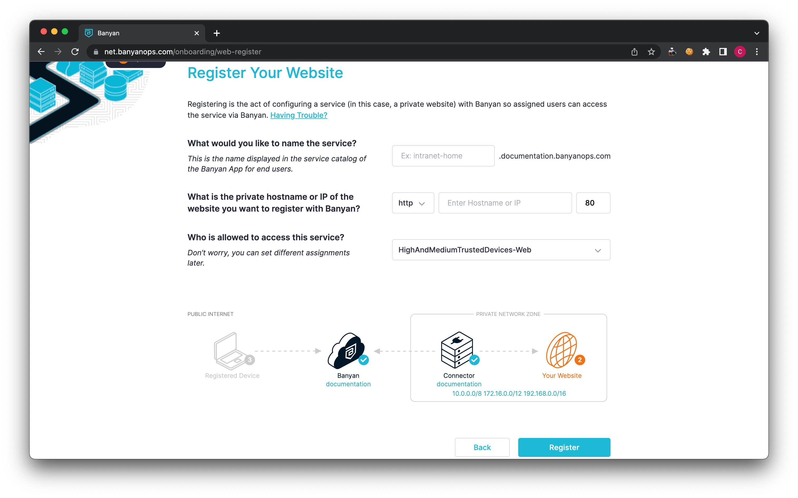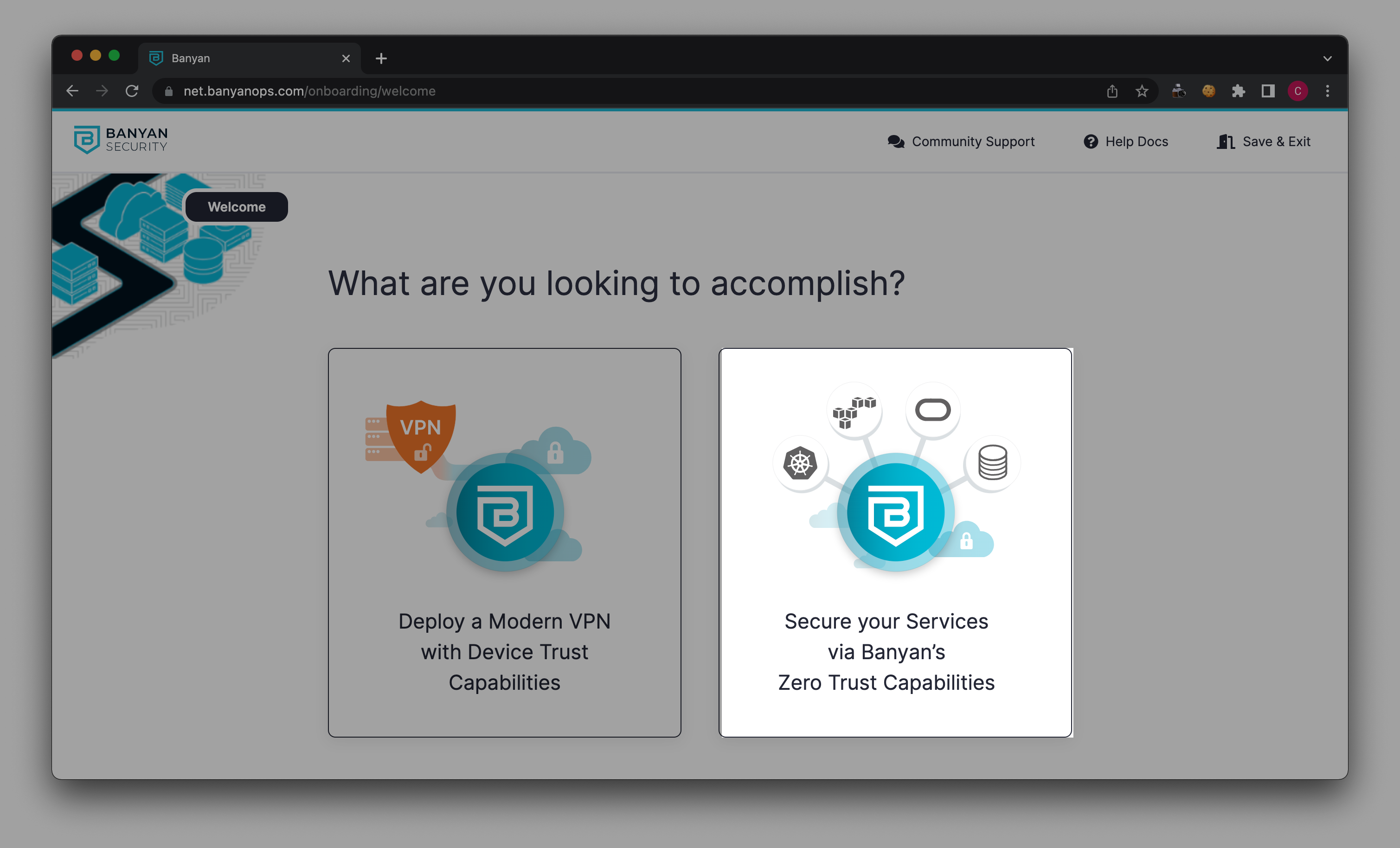To do this, complete Onboarding by selecting Explore the Banyan Console, and complete the following steps: