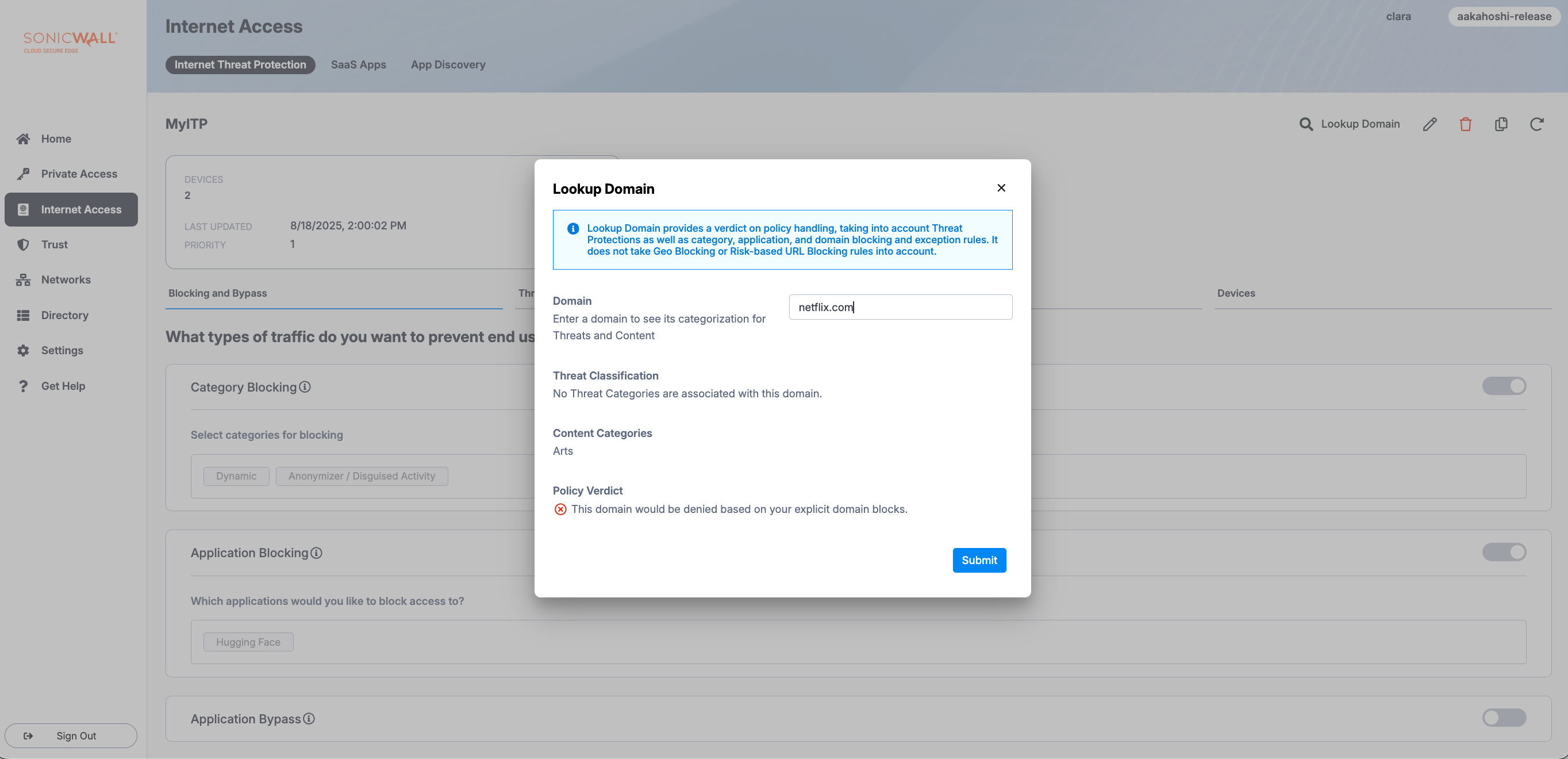 Check for network connectivity, verify that the applicable ITP policy configuration is accurate and current (e.g., check which domain categories, apps, specific domains, and geo-locations you’ve selected to block), and verify your org’s licensing (i.e., ensure that you have SIA licenses).