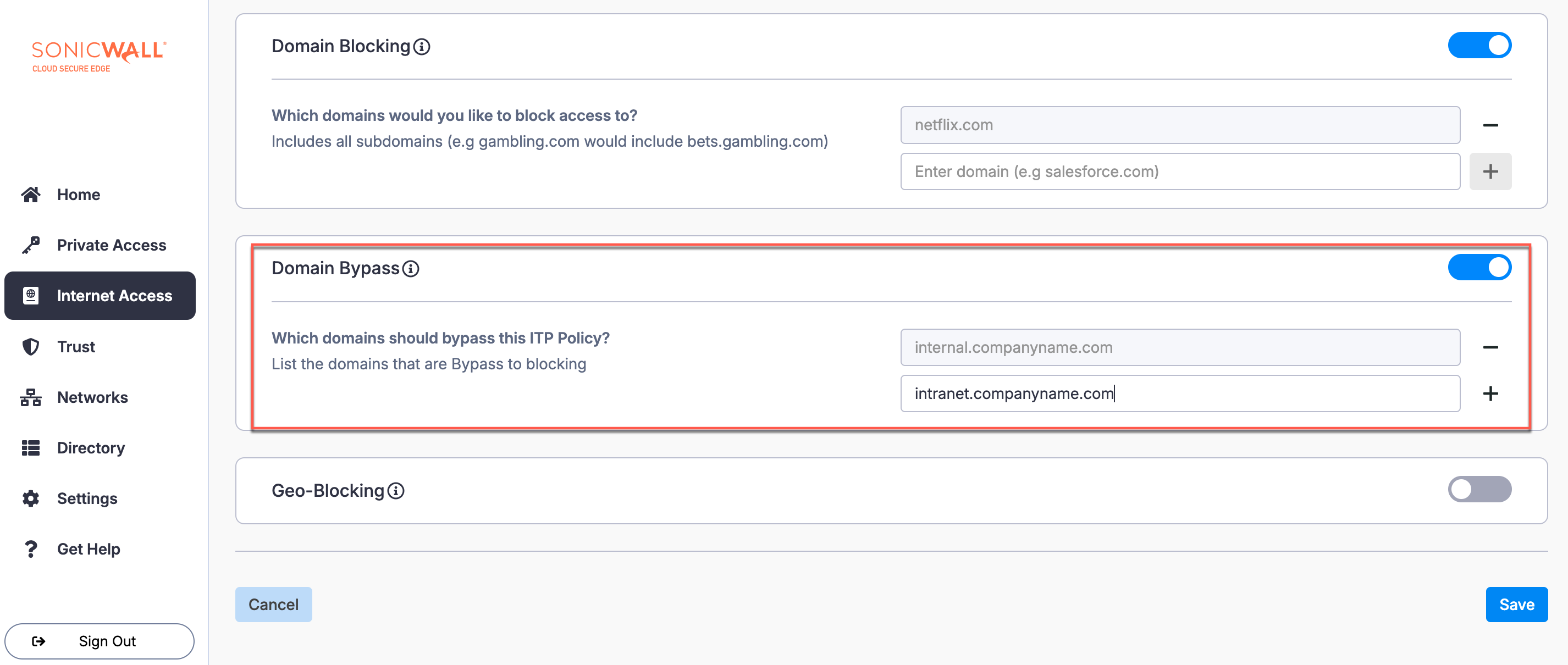 Select the Edit icon (i.e., the pencil icon), and under the Blocking and Bypass tab, go to the Domain Bypass toggle.