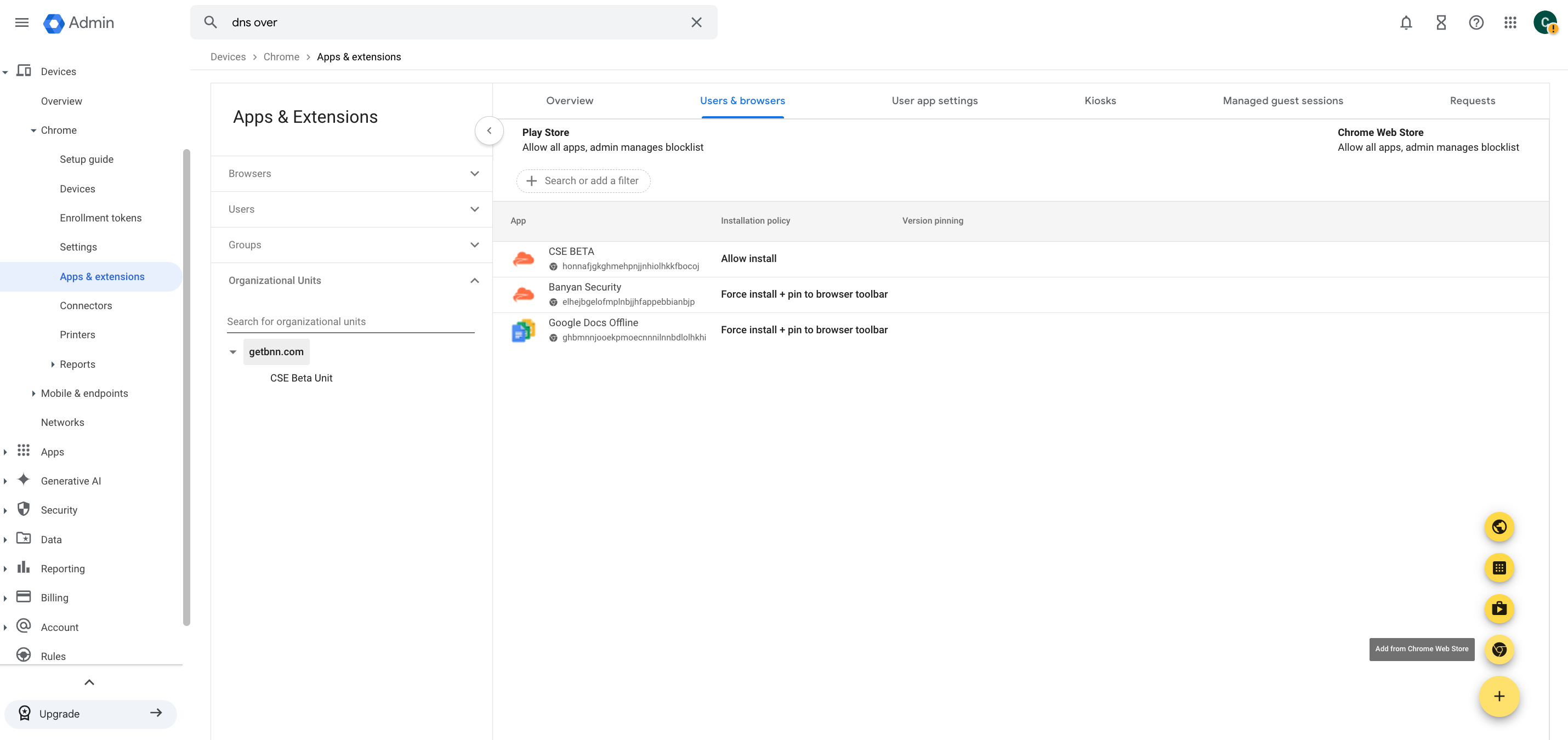 9. Copy the variables presented in Step 6 in the Zero Touch Enrollment tab in the Command Center. In your Google Admin account, navigate to Devices > Chrome > Apps & extensions > Users and Browsers > CSE Extension.