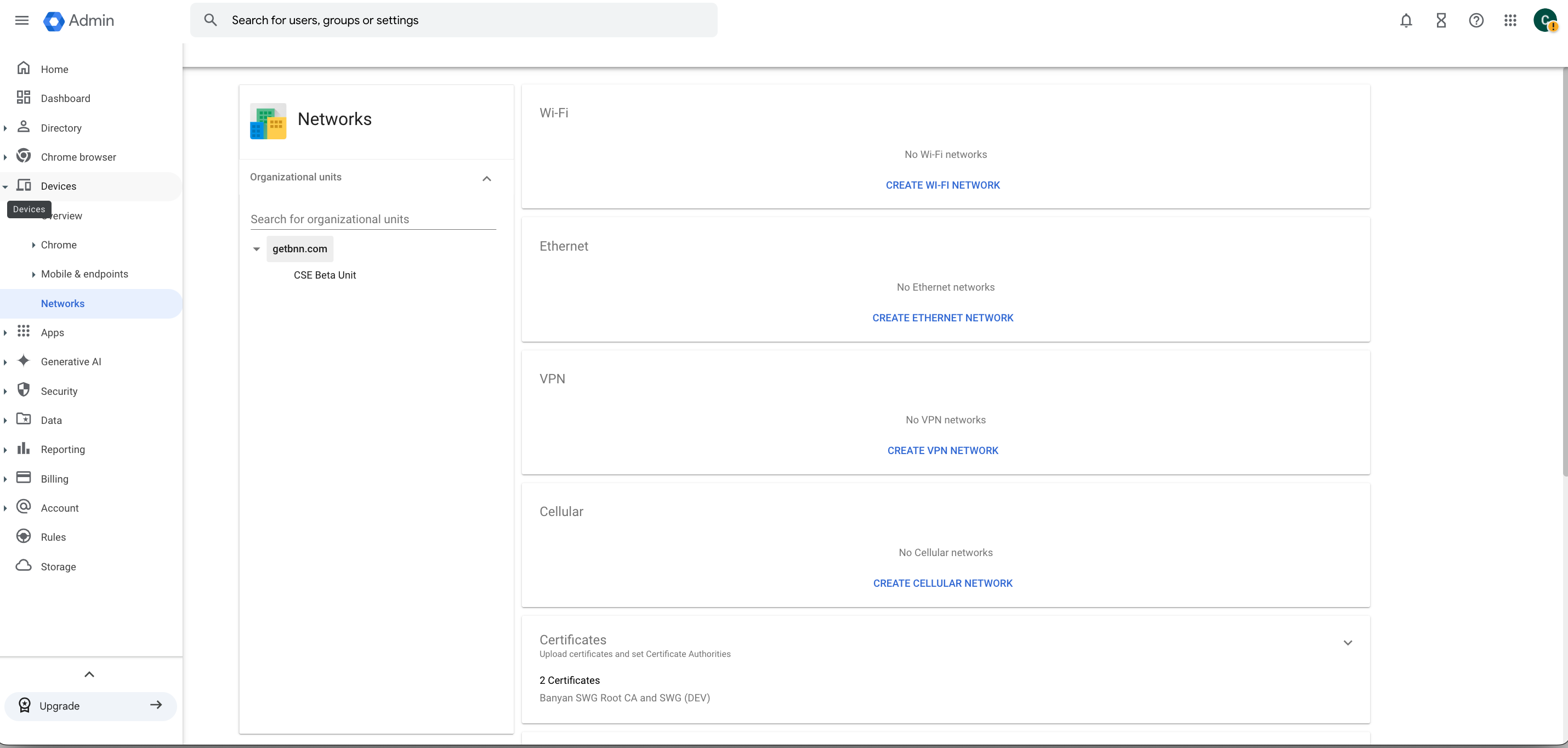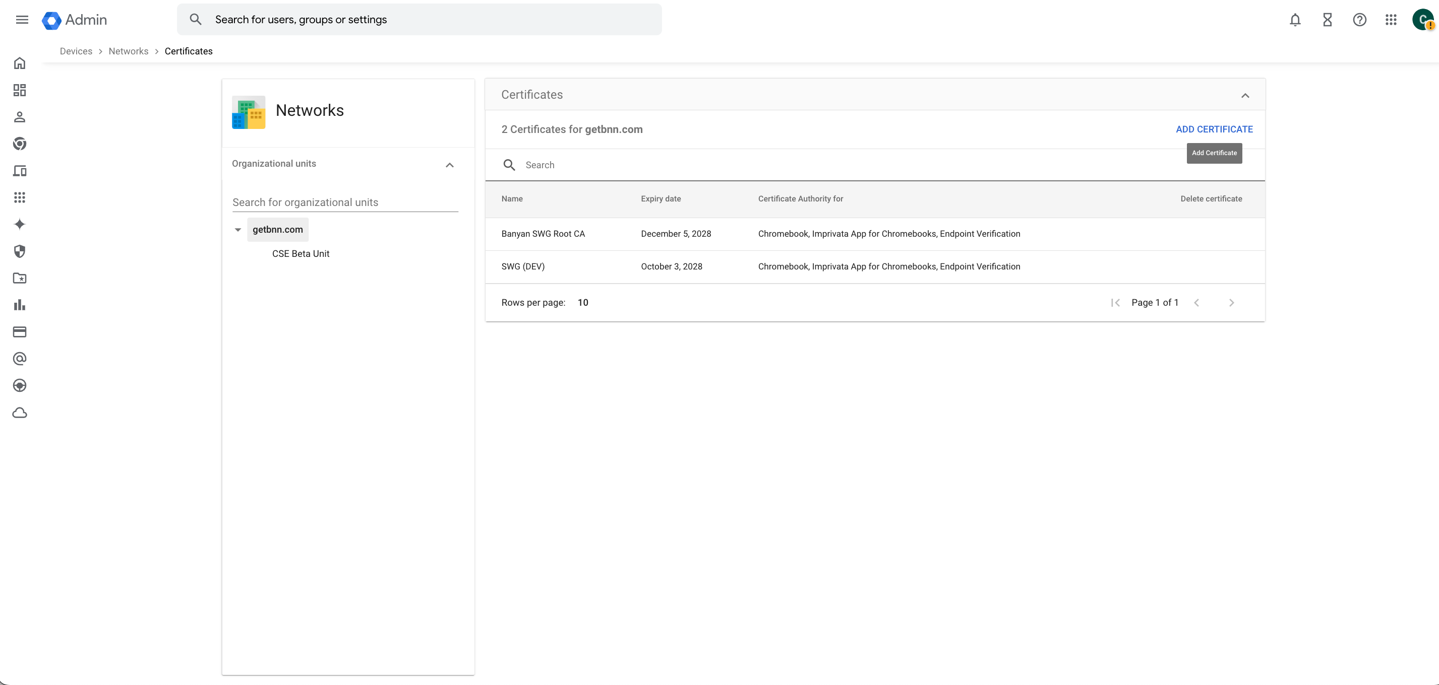 3. Log into your Google Admin account, and navigate to Devices > Networks > Certificates. Select ADD CERTIFICATE. Ensure that you check off the Enabled for Chromebook option. Name and upload the CSE Certificate PEM file from your Downloads.