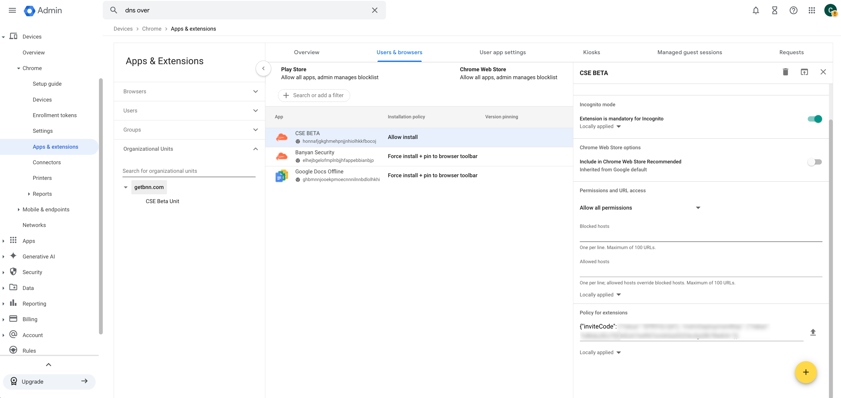 10. Select the CSE Extension, then set the Installation Policy to force install. Toggle the option under Incognito Mode to Extension is mandatory for Incognito. Scroll to the bottom and paste the variables in the Policy for Extensions field.