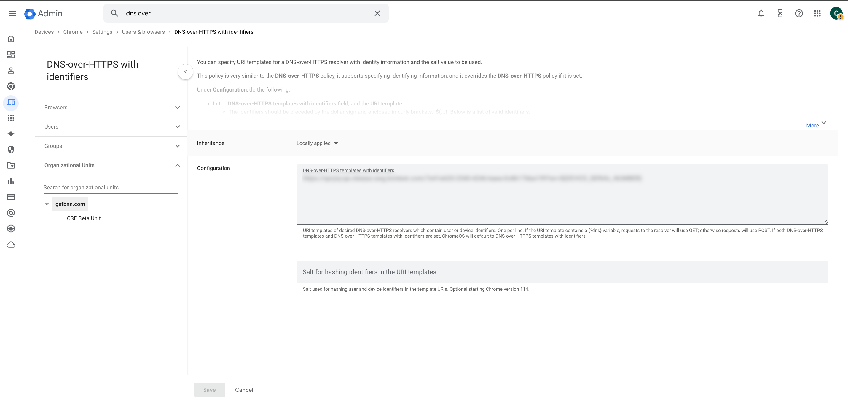 6. Copy the DoH URL with identifiers (presented in Step 4 in the Zero Touch Enrollment tab in the Command Center). In your Google Admin account, navigate to Devices > Chrome > Settings > DNS-over-HTTPS with identifiers, and paste the URL in the configuration section.