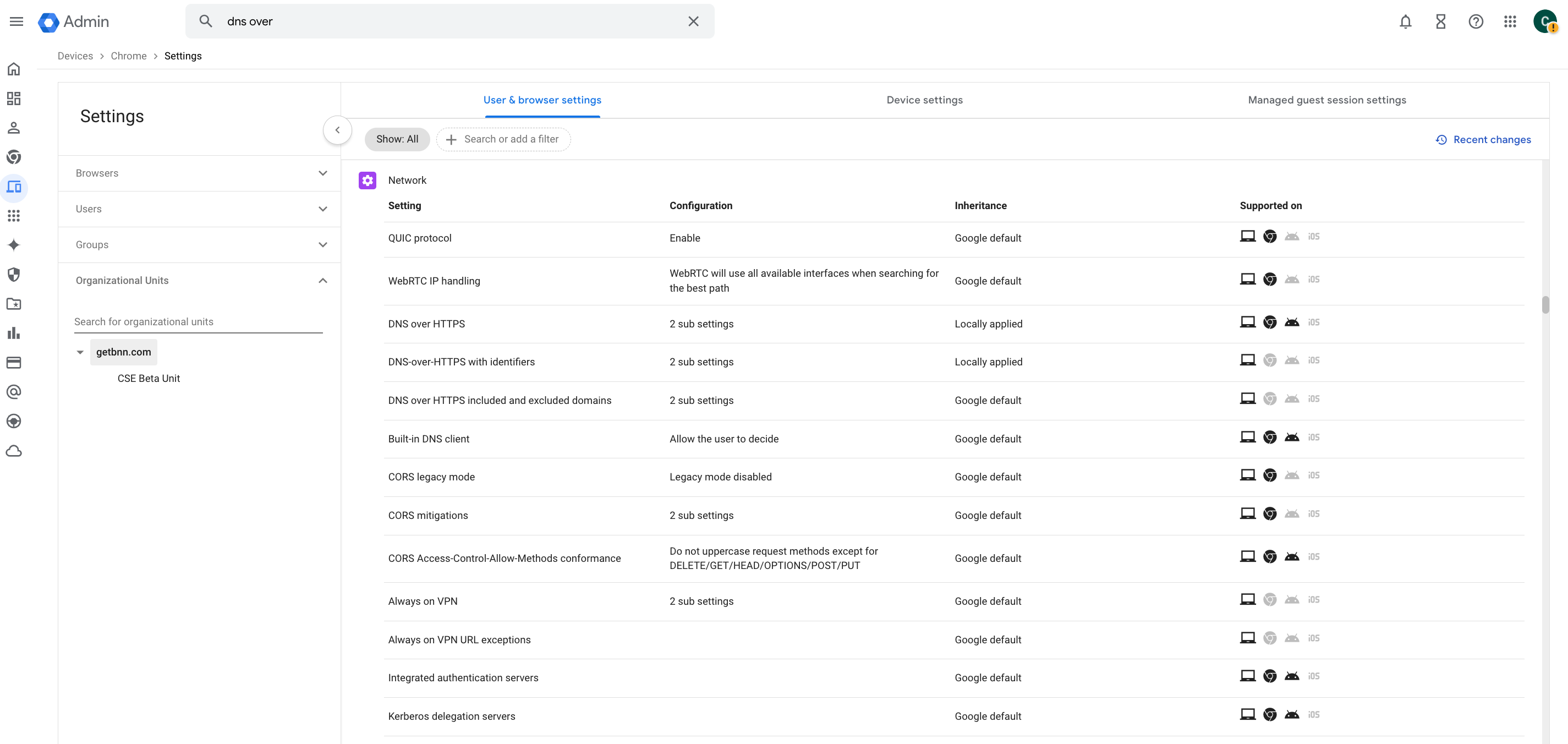 4. Copy the DoH URL (presented in Step 3 in the Zero Touch Enrollment tab in the Command Center) using the Copy button in the Command Center. In your Google Admin account, navigate to Devices > Chrome > Settings > DNS over HTTPS, and paste the DoH URL in the configuration section. Before saving, select the configuration option to Prefer DNS over HTTPS, but allow insecure fallback.