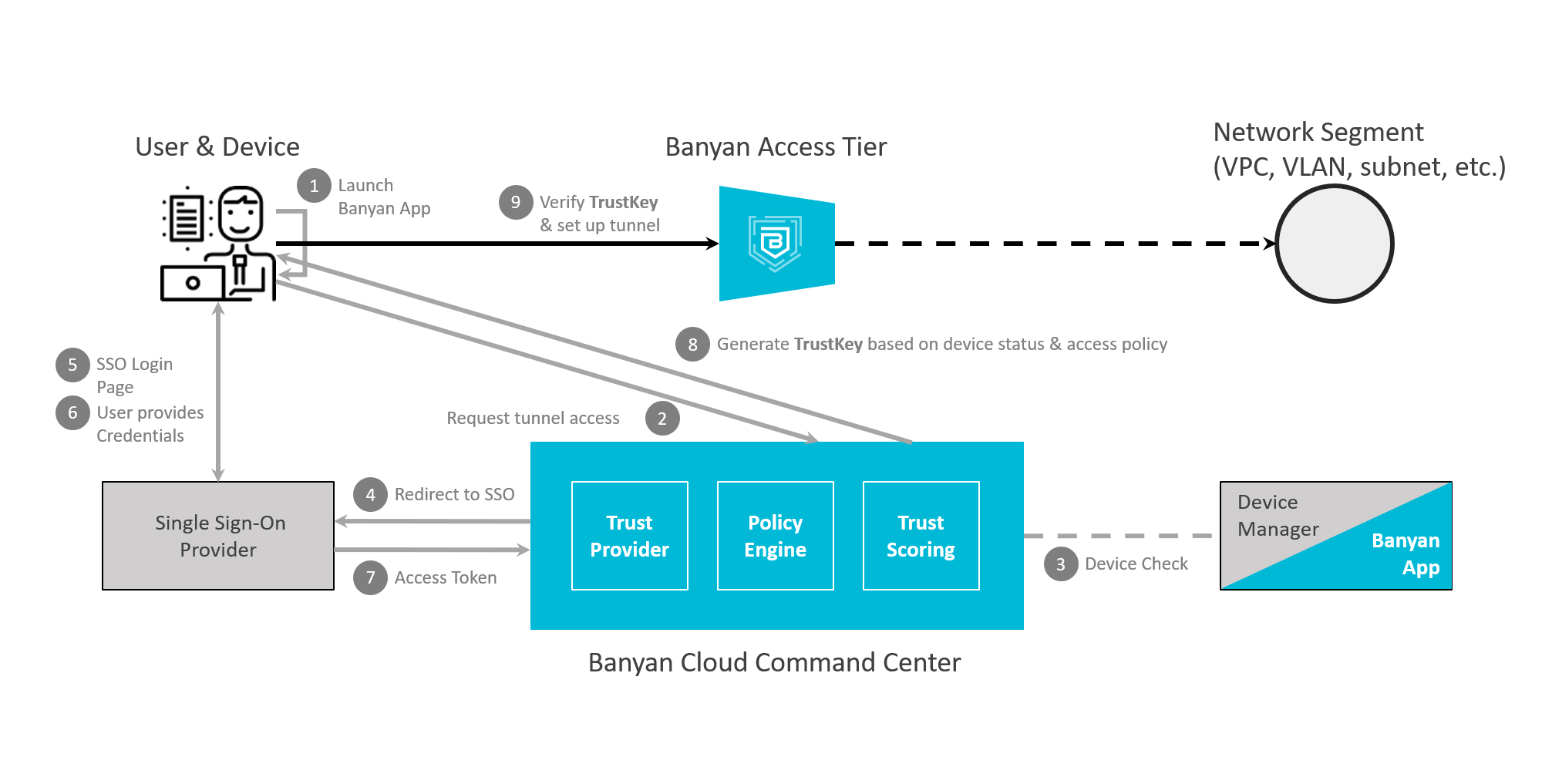 The flow diagram below describes how CSE’s zero-trust access control mechanism works for Service Tunnels. Review the Publish a Service Tunnel to Users guide to see how to create a Zero Trust policy for a service tunnel so a user can access the tunnel via the desktop app.