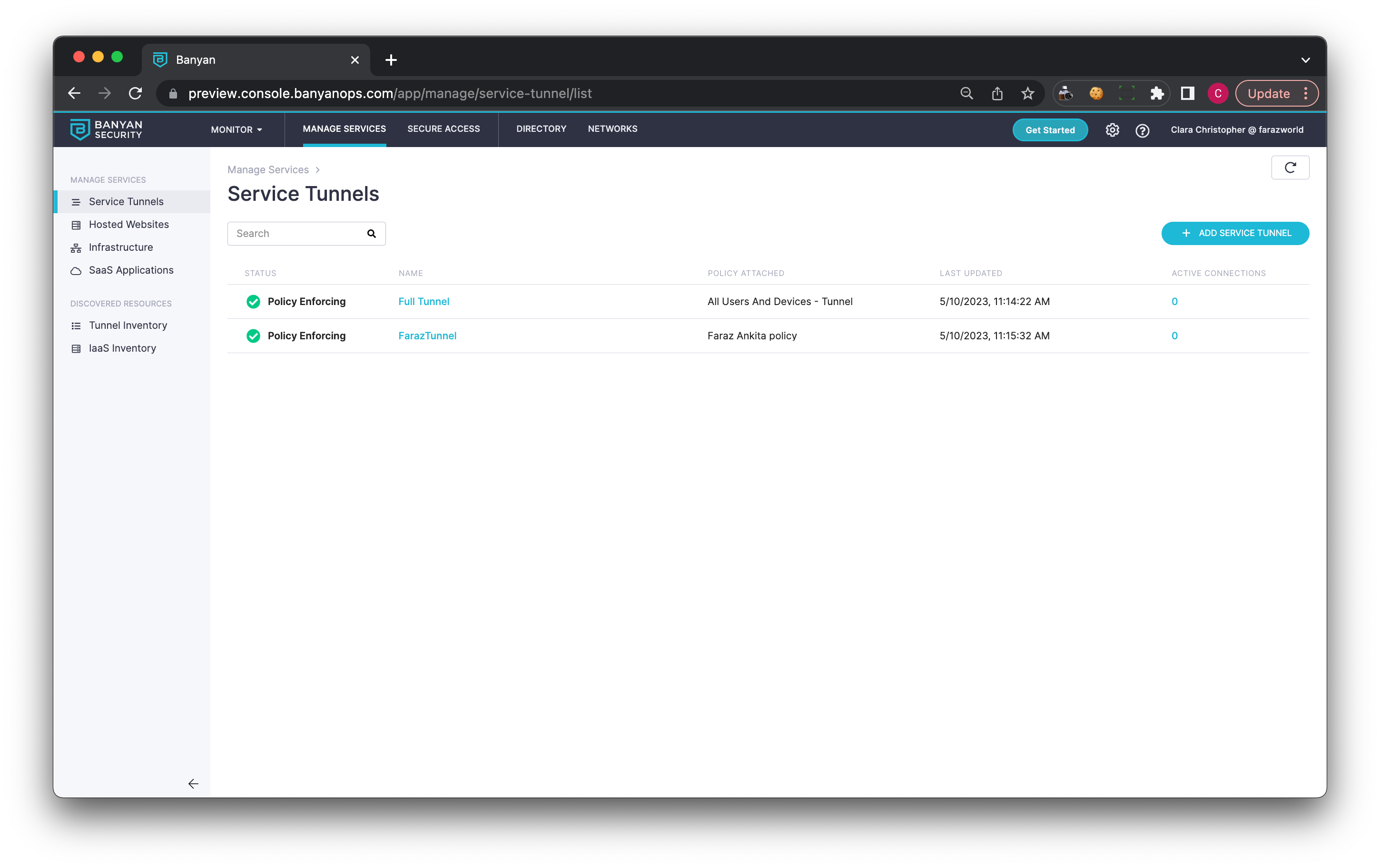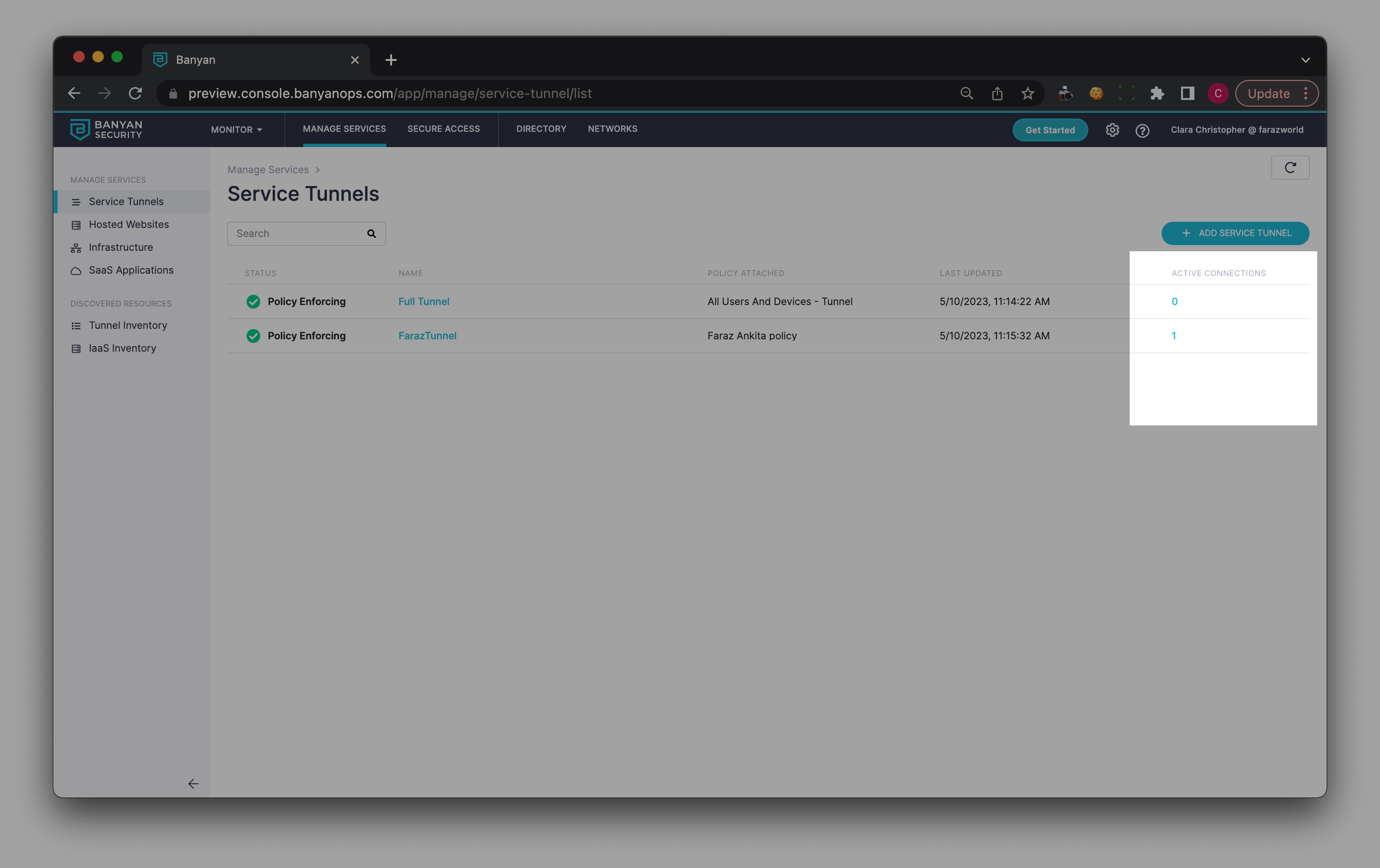 2. In the Service Tunnels list, view the last column called Active Connections, which displays a count of devices currently connected to the respective Service Tunnel.