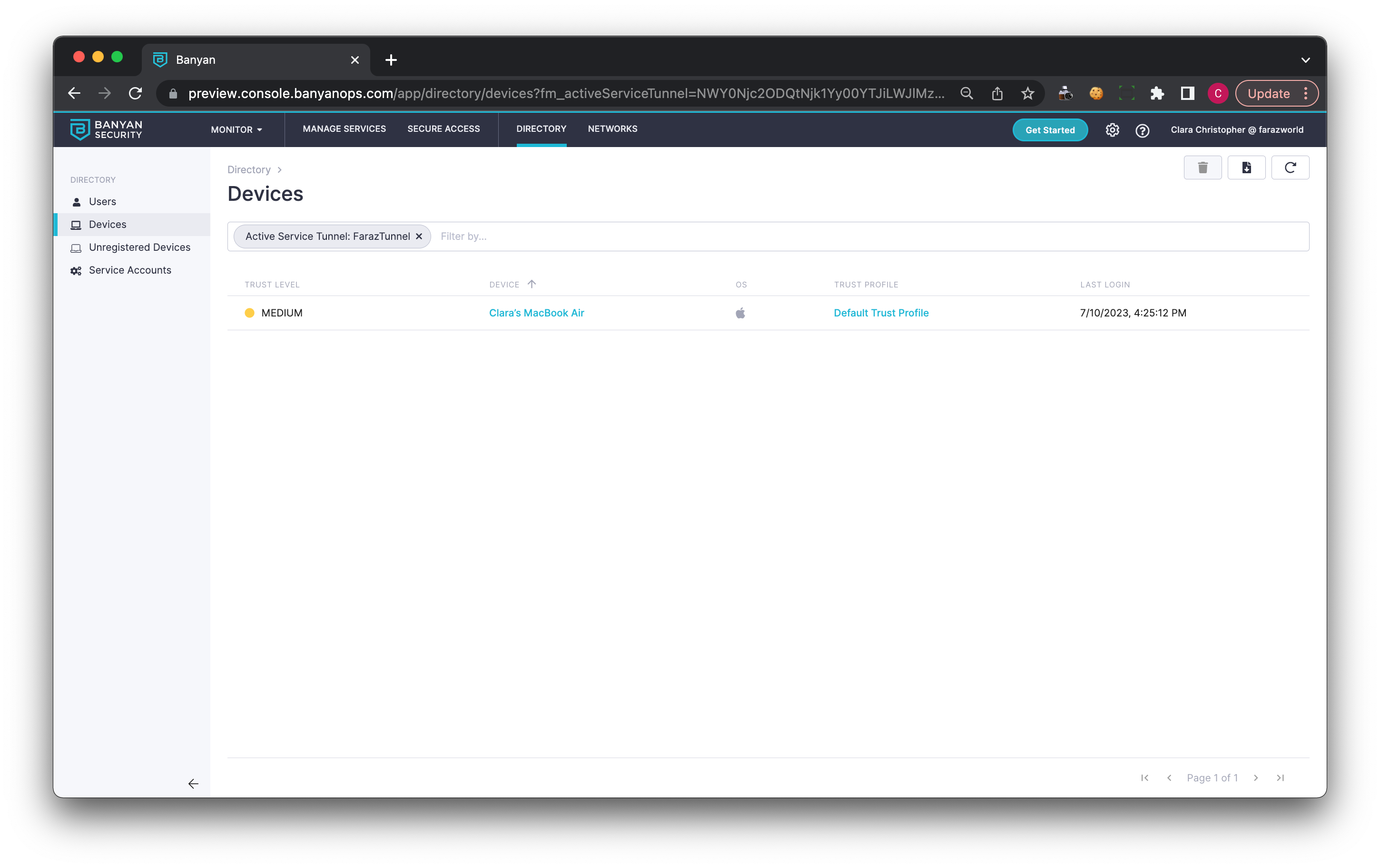Admins can view how many users are actively connected to a given Service Tunnel via the Command Center. Device details, including operating system, Trust Level, associated Trust Profiles, and Last Login, are easily viewable.
