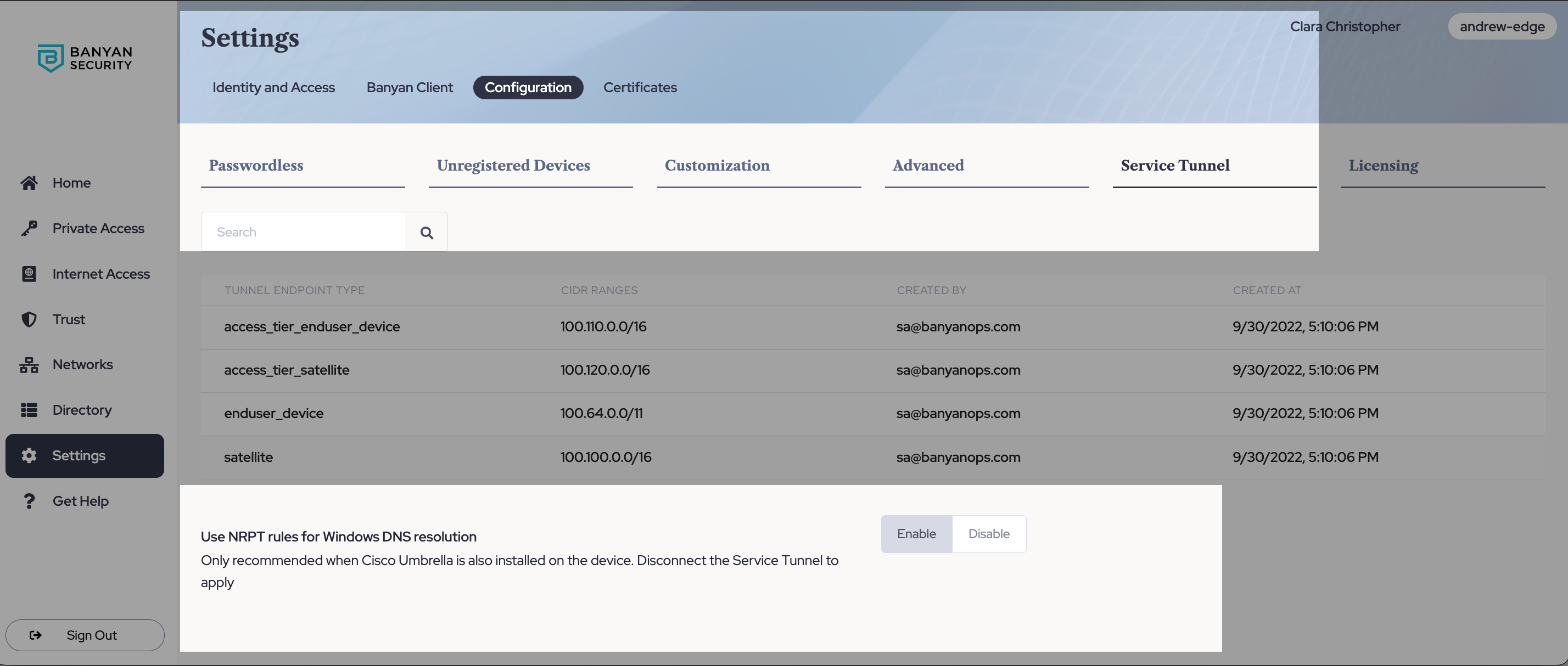 In the Command Center, navigate from Settings > Configurations > Service Tunnels.
