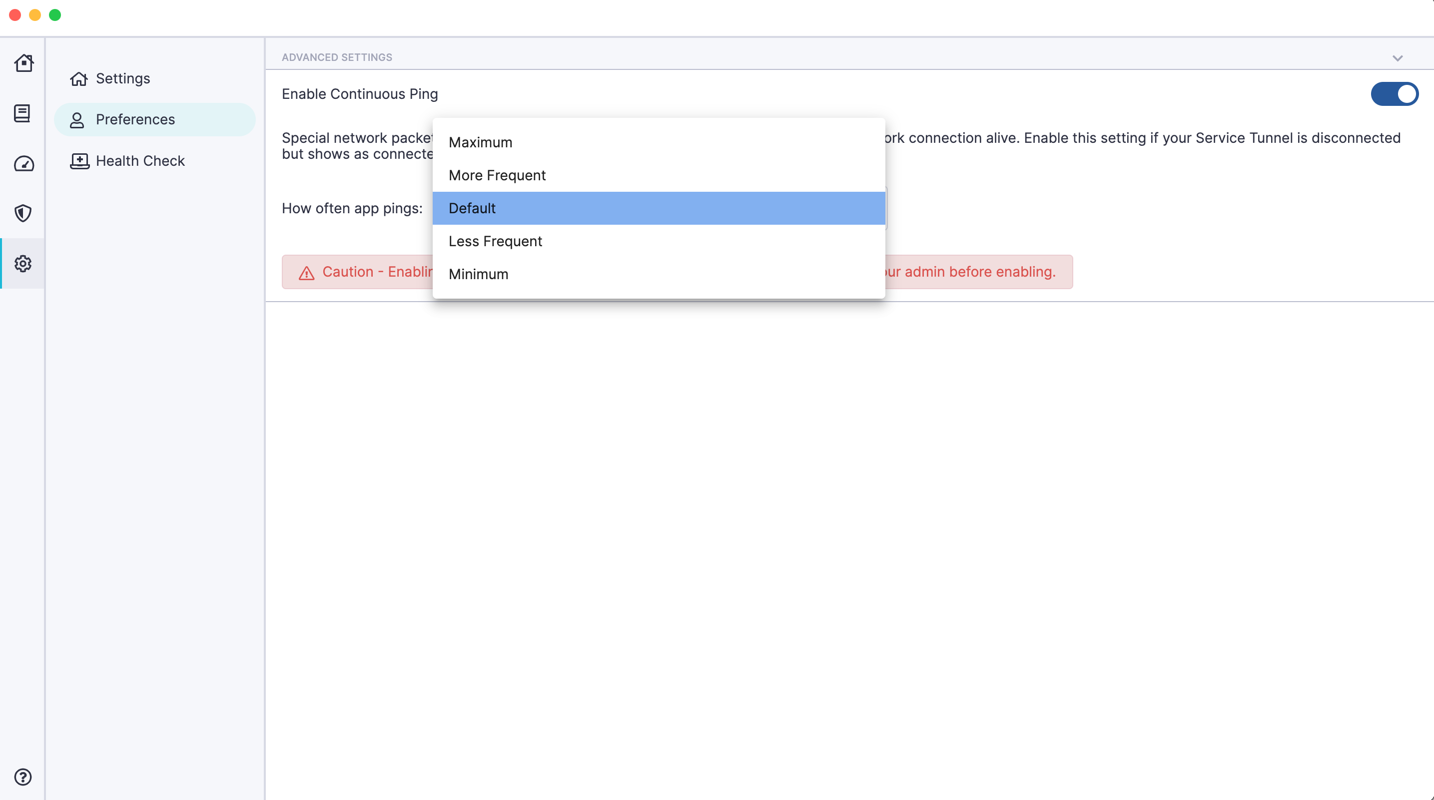In the CSE desktop app, navigate from Settings > Preferences > Advanced Settings, and toggle on Enable Continuous Ping.