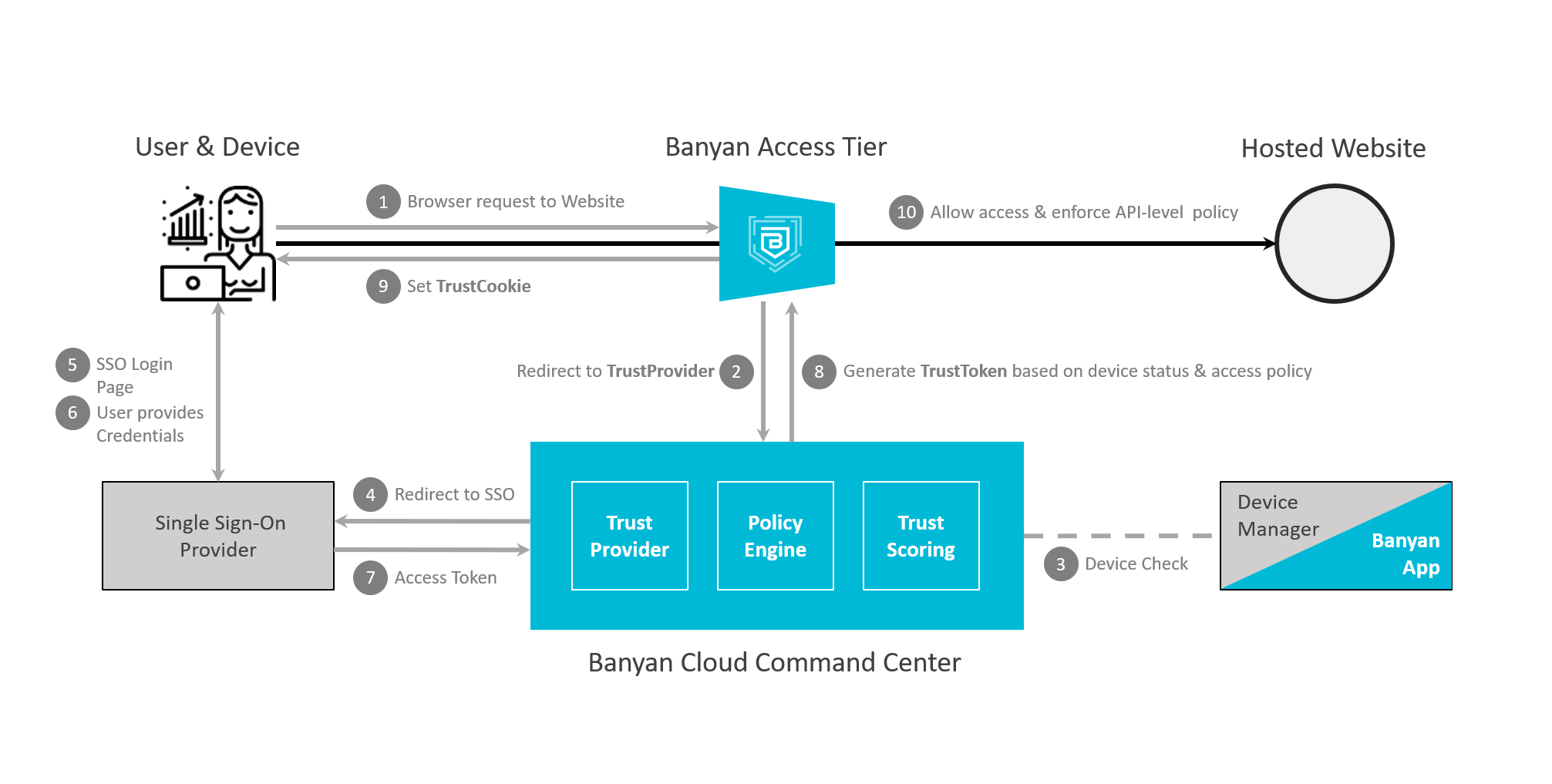 The flow diagrams below describes how CSE’s zero-trust access control security mechanism works for Hosted Websites. Review the Publish a Website to Users guide to see how to create a Zero Trust policy for a website and conveniently access it from a web browser.
