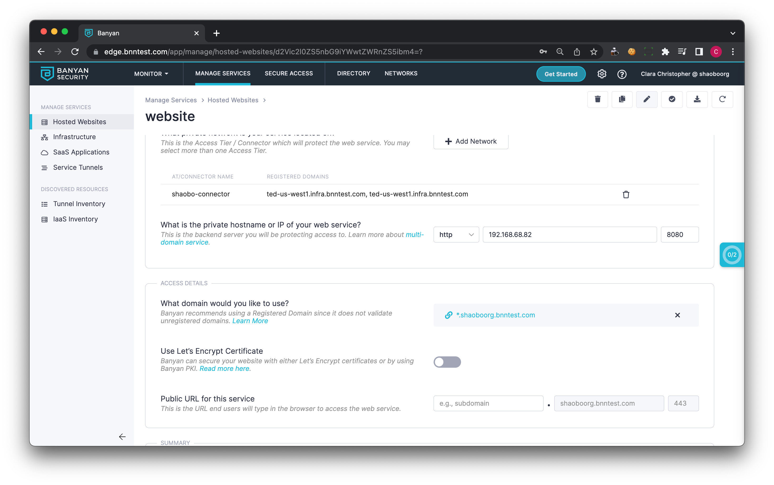 For example, if you need to serve two multi-domain services at *.web1.example.com and *.web2.example.com via a Banyan Netagent with IP address 1.2.3.4, you only need to configure a DNS A Record for *.example.com, pointing to 1.2.3.4.