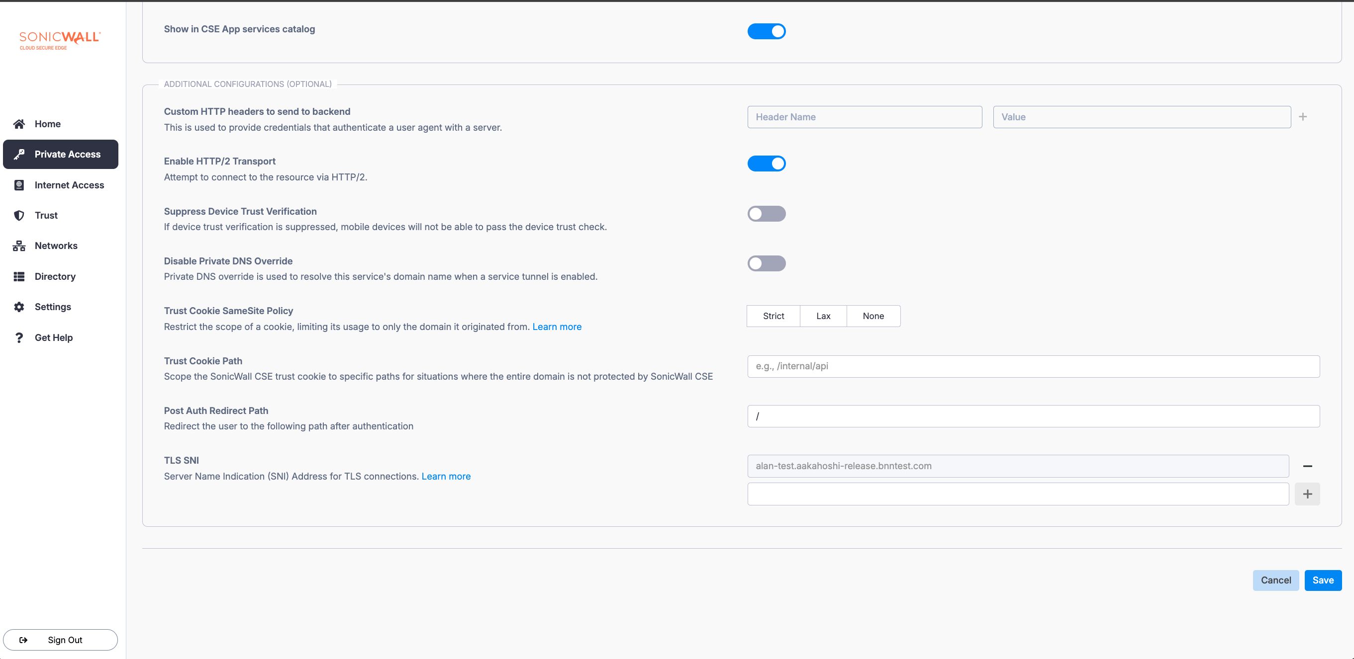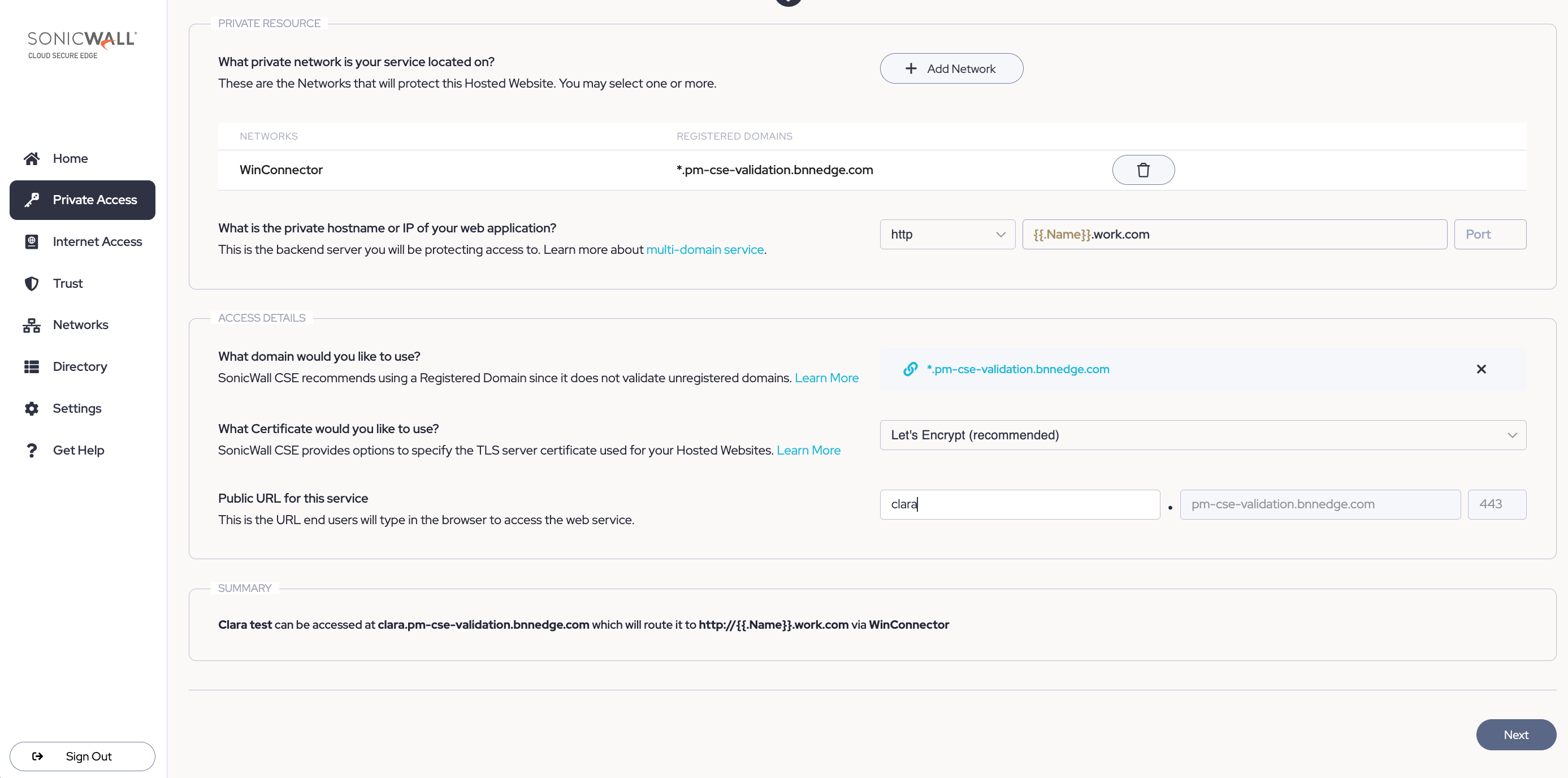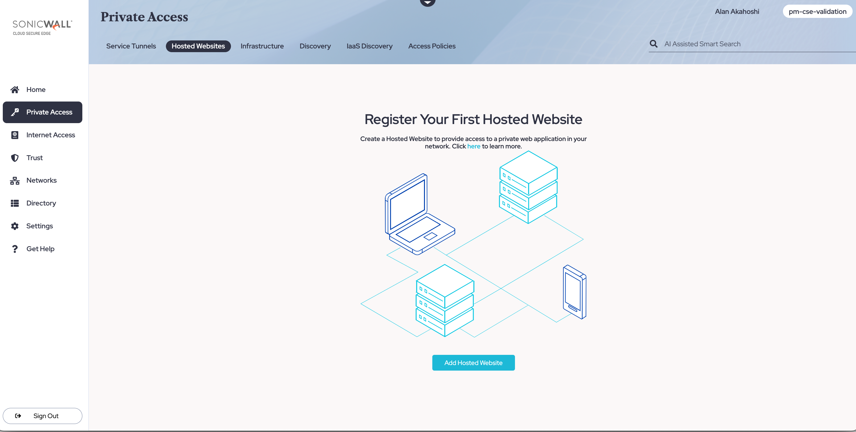 SonicWall Cloud Secure Edge (CSE) authenticates your end users so that they can securely access select websites via their web browsers. Registering a hosted web service allows you to enforce a zero-trust policy when users try to access your internal website or web application.