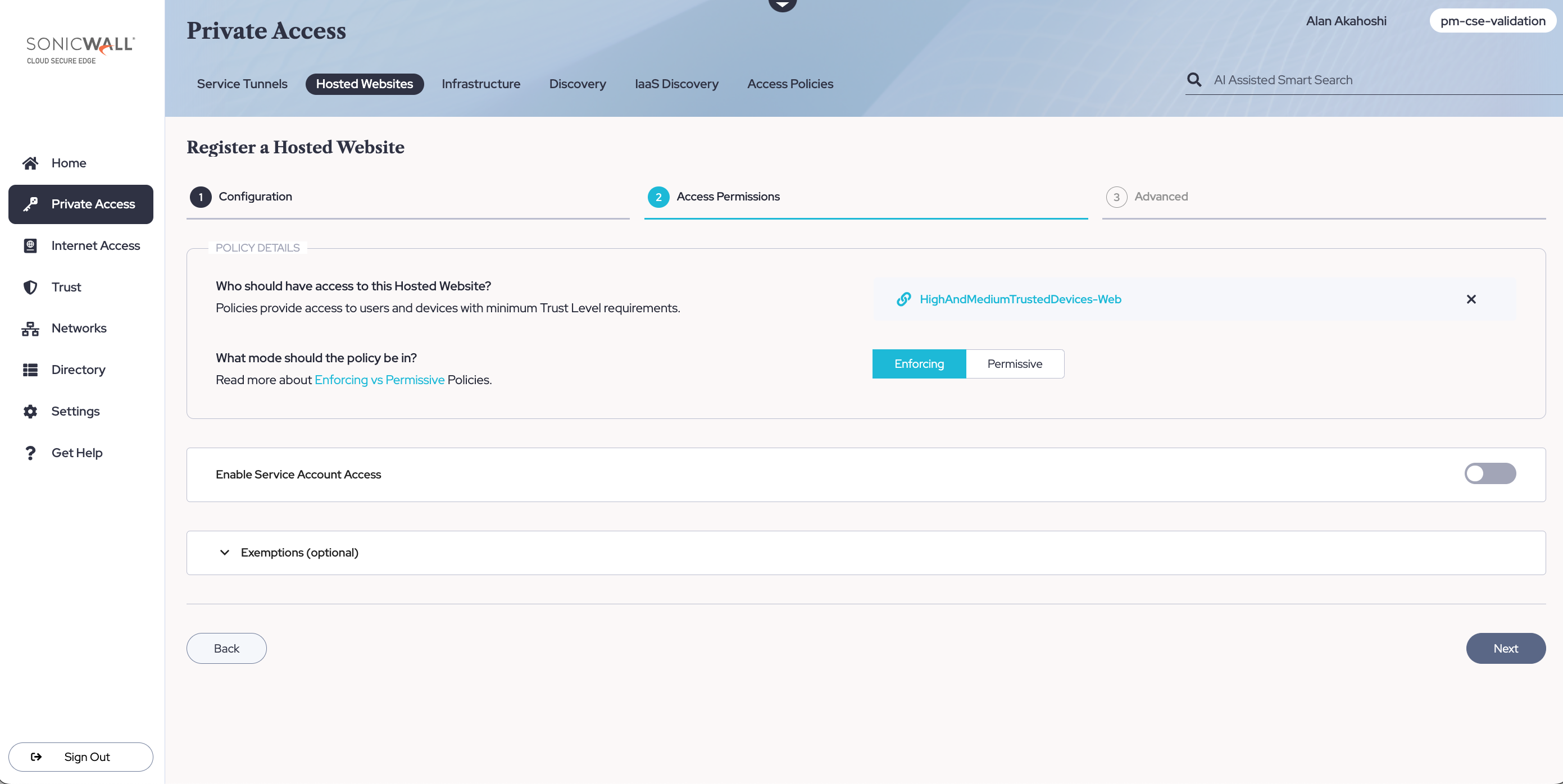 2.11 Optional: Configure exemptions to access permissions to your web service. Exemptions can include source CIDRs, target domains, paths, request methods, and request headers. See the Exemptions doc for more detailed information on how Exemptions work in CSE.