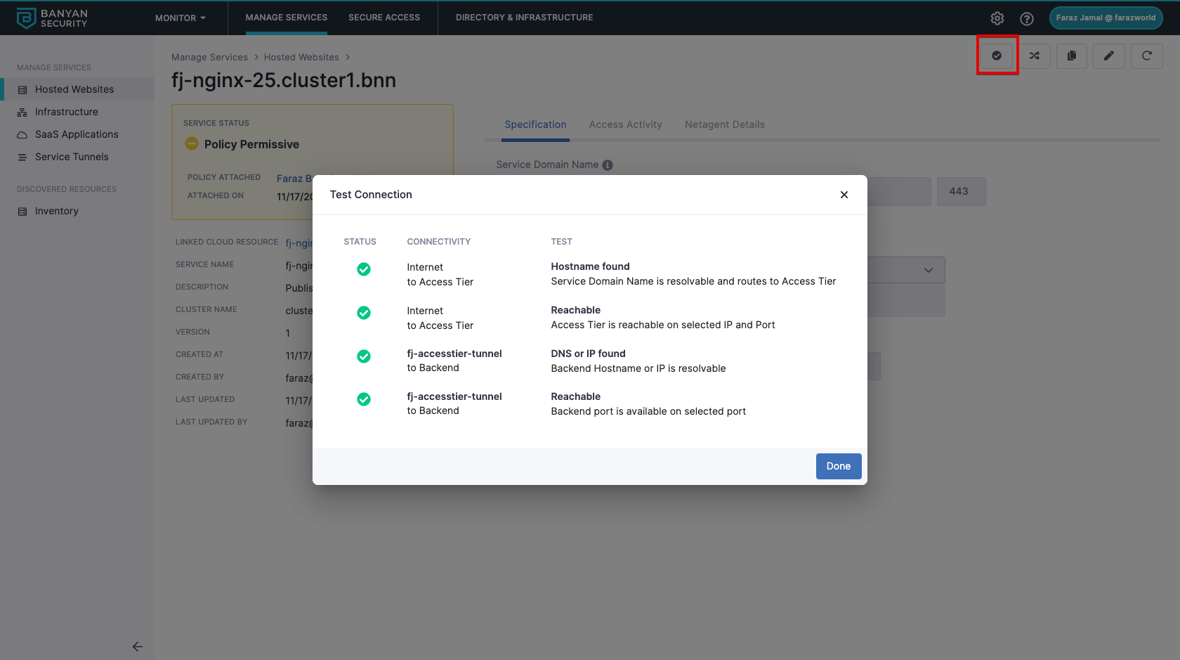 In the Command Center, navigate from Private Access > Hosted Websites, then select a Service Name. In your service, select Test Connection (the check icon in the upper right corner of the page). This will show you the status of your connection, detailing whether your domain name or hostname are resolvable and whether the Access Tier and backend port are reachable.