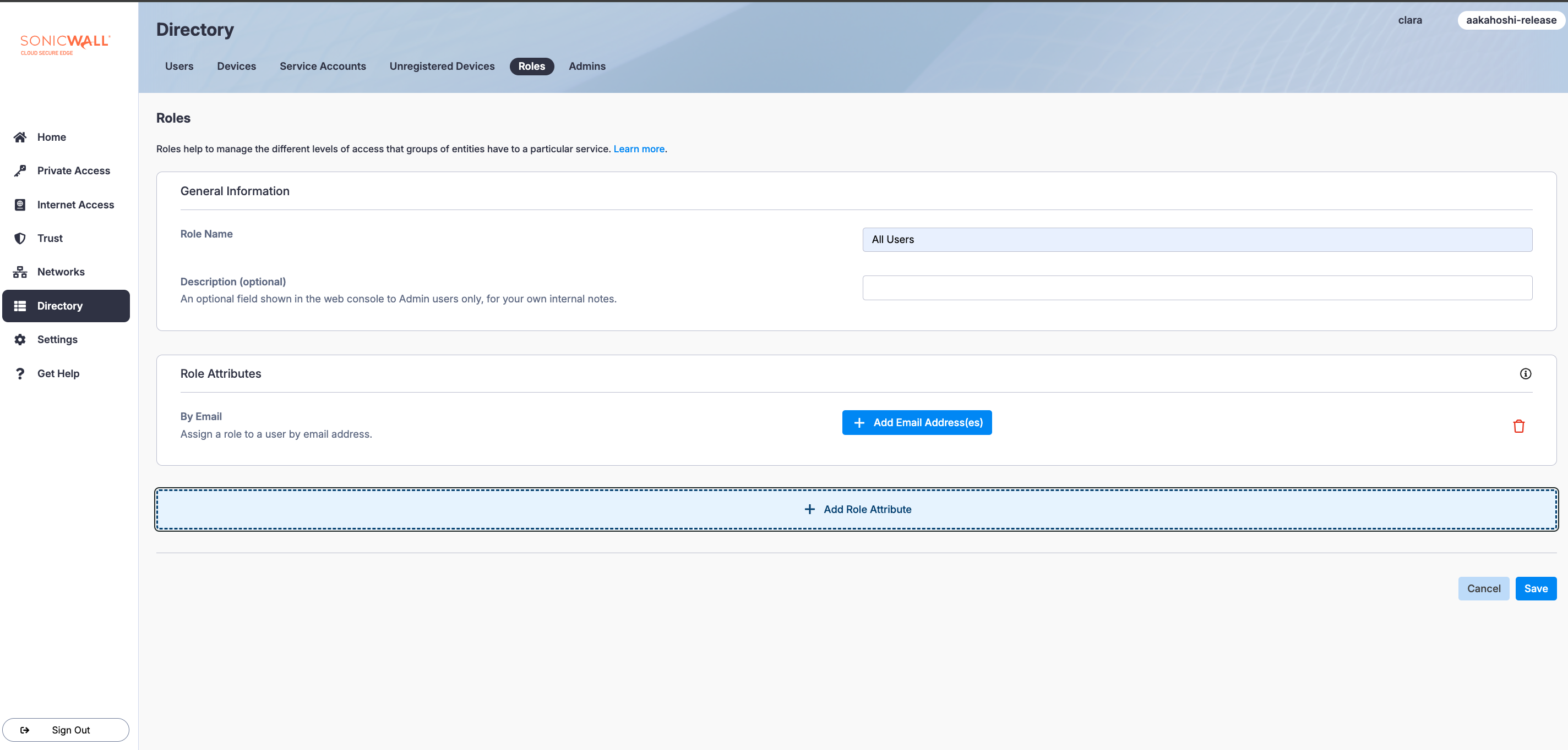 1.1 In the Command Center, navigate to Directory > Roles, and then select + Add Role. Enter a Role Name (and description) and then select Add Role Attribute to specify sets of users and devices.