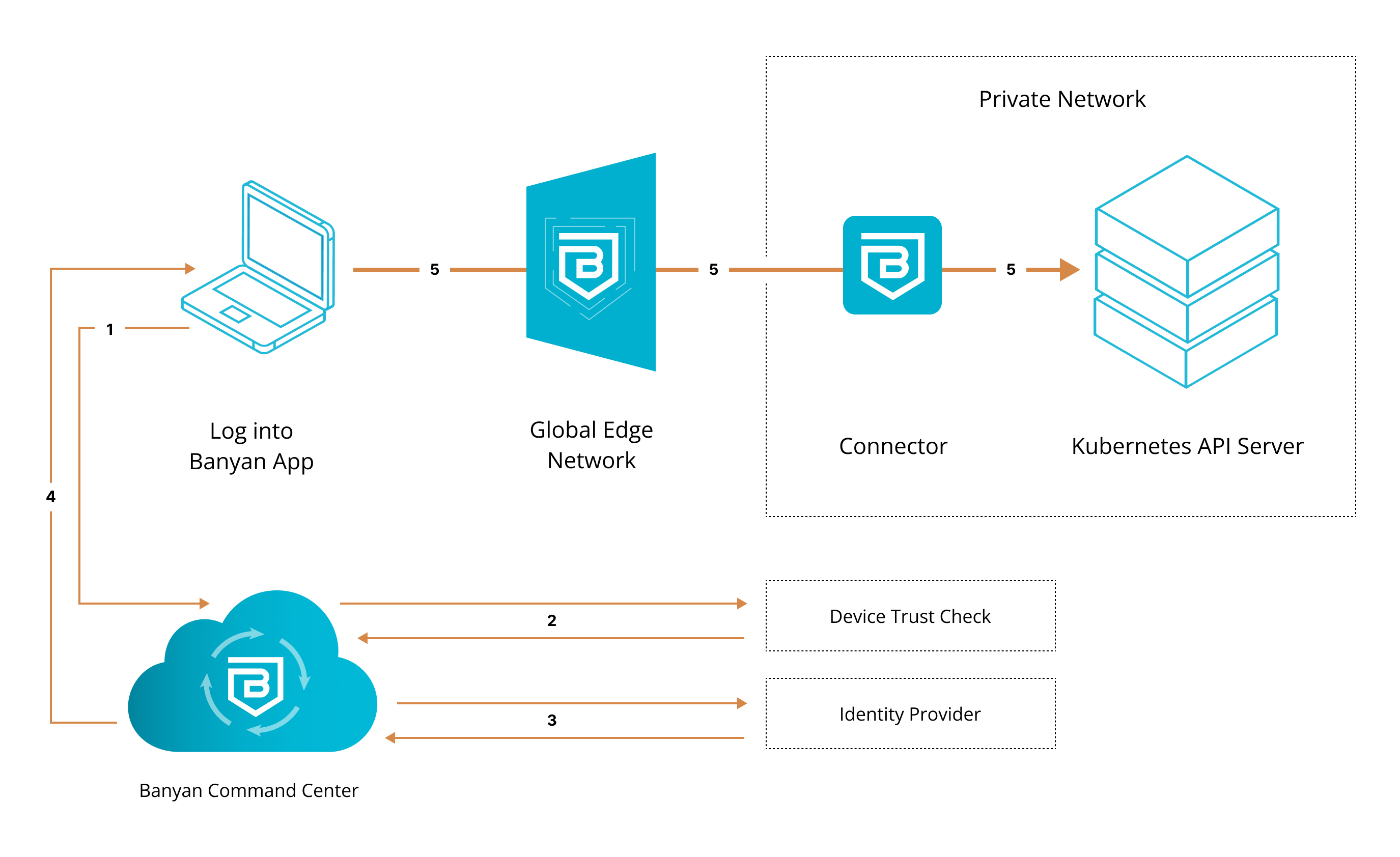 5. User’s request is passed to the Global Edge Network, relayed to the Connector inside the org’s private network, and then sent to the Kubernetes API server.