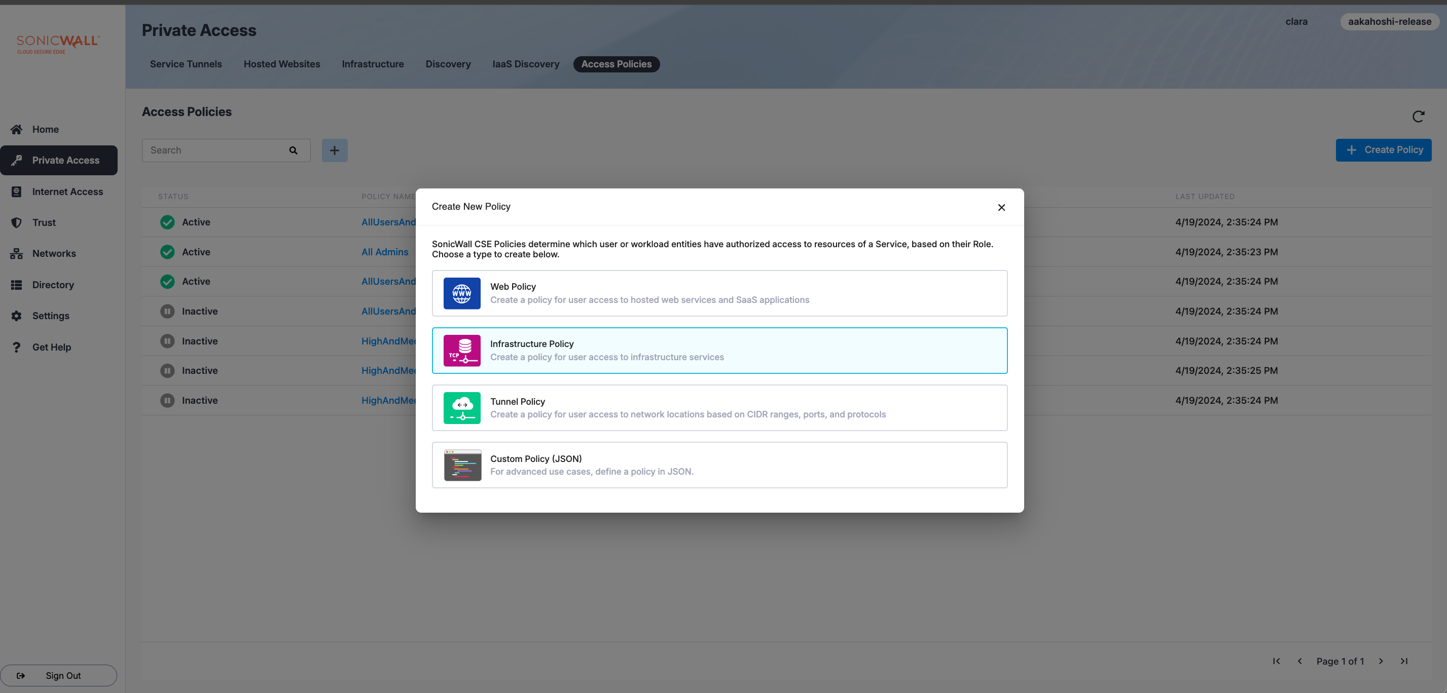 2.1 Navigate from Private Access > Access Policies, and then select + Create Policy. Select the Infrastructure Policy option.