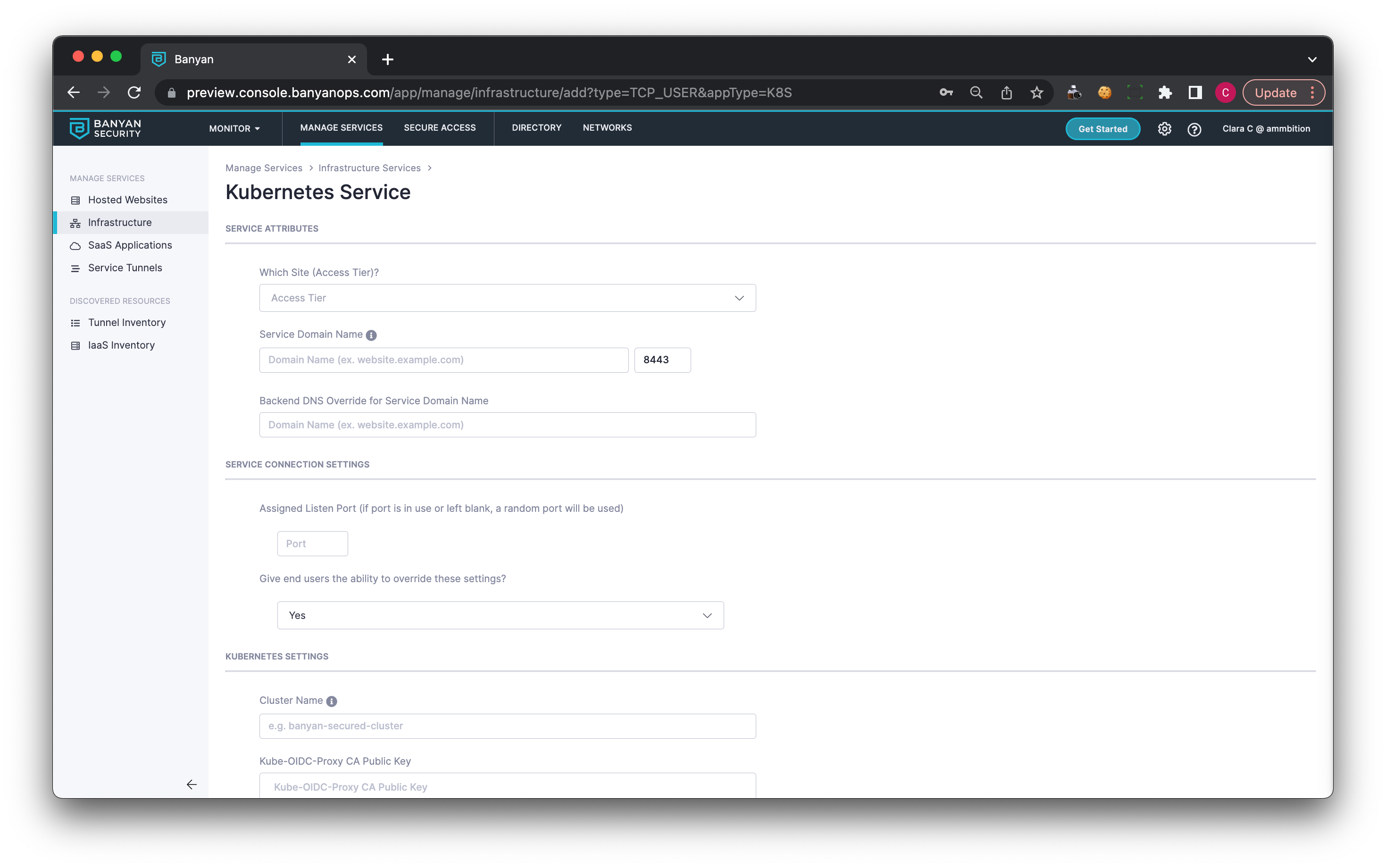 3.7 Select a Service Domain Name for this service (e.g.,mykube.corp.example.com ); the banyanproxy will tunnel Kubernetes traffic over the assigned listen port.