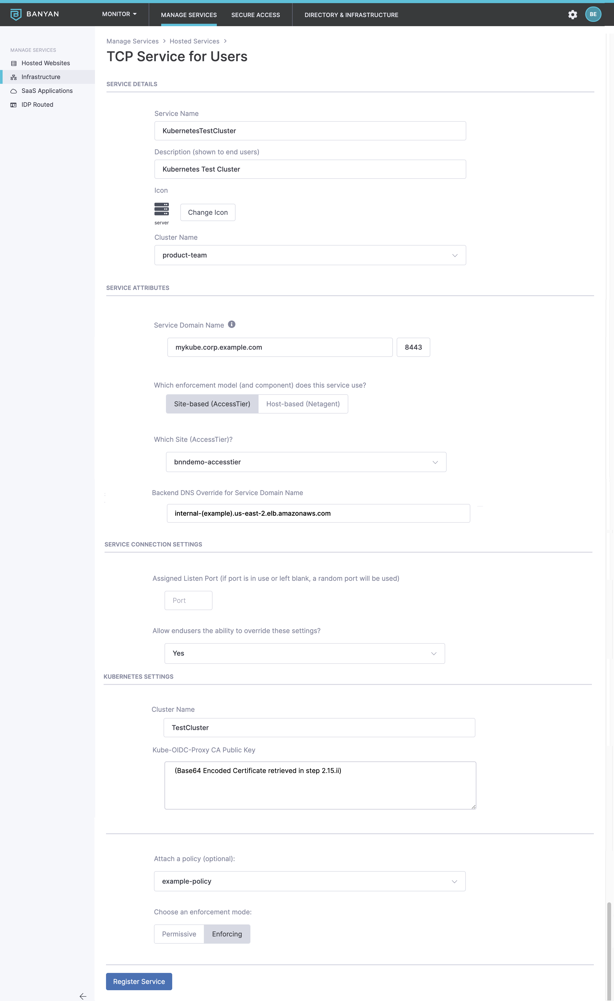 In this example, we have created a Service Domain Name called mykube.corp.example.com. This is your new Kube API endpoint. The banyanproxy on your end user’s devices will automatically tunnel Kubernetes traffic to this domain.