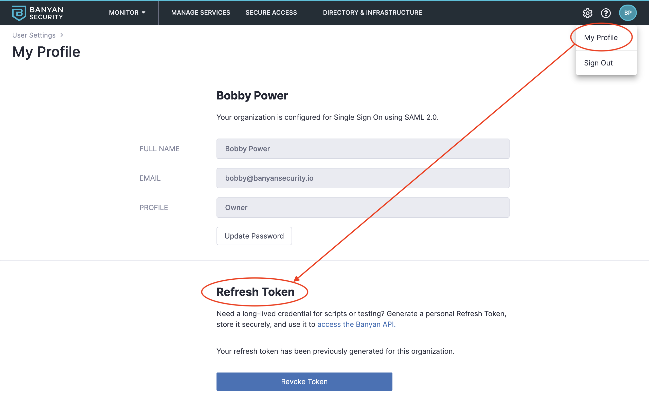 SAML Admins log in via Single Sign-On and cannot generate a Refresh Token. You must be logged into the Command Center as a Local CSE (formerly Banyan) Admin in order to generate a Refresh Token. If you are a SAML Admin, please have your account Owner create a Local Admin account using a unique email address, and use that Local Admin account before proceeding to the steps below.