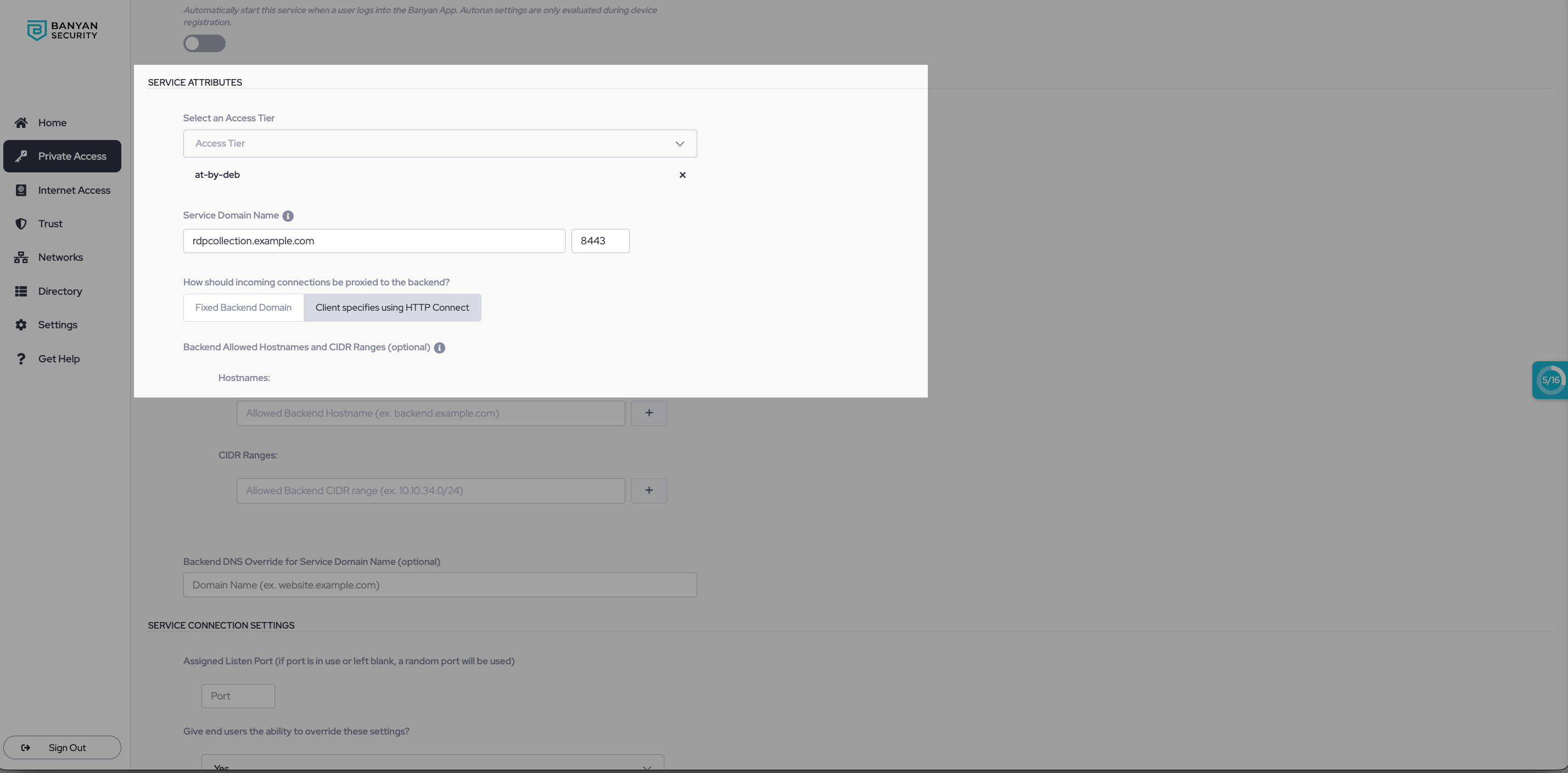 3. Configure the remaining Service Attributes fields, making sure to set the method for how incoming connections should be proxied to the backend to Client specified using HTTP Connect.