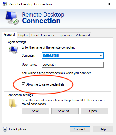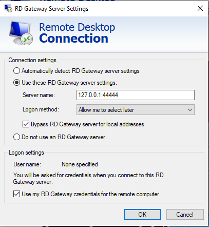 In Logon settings, enable Use my RD Gateway credentials for the remote computer.
