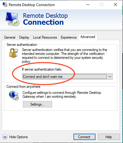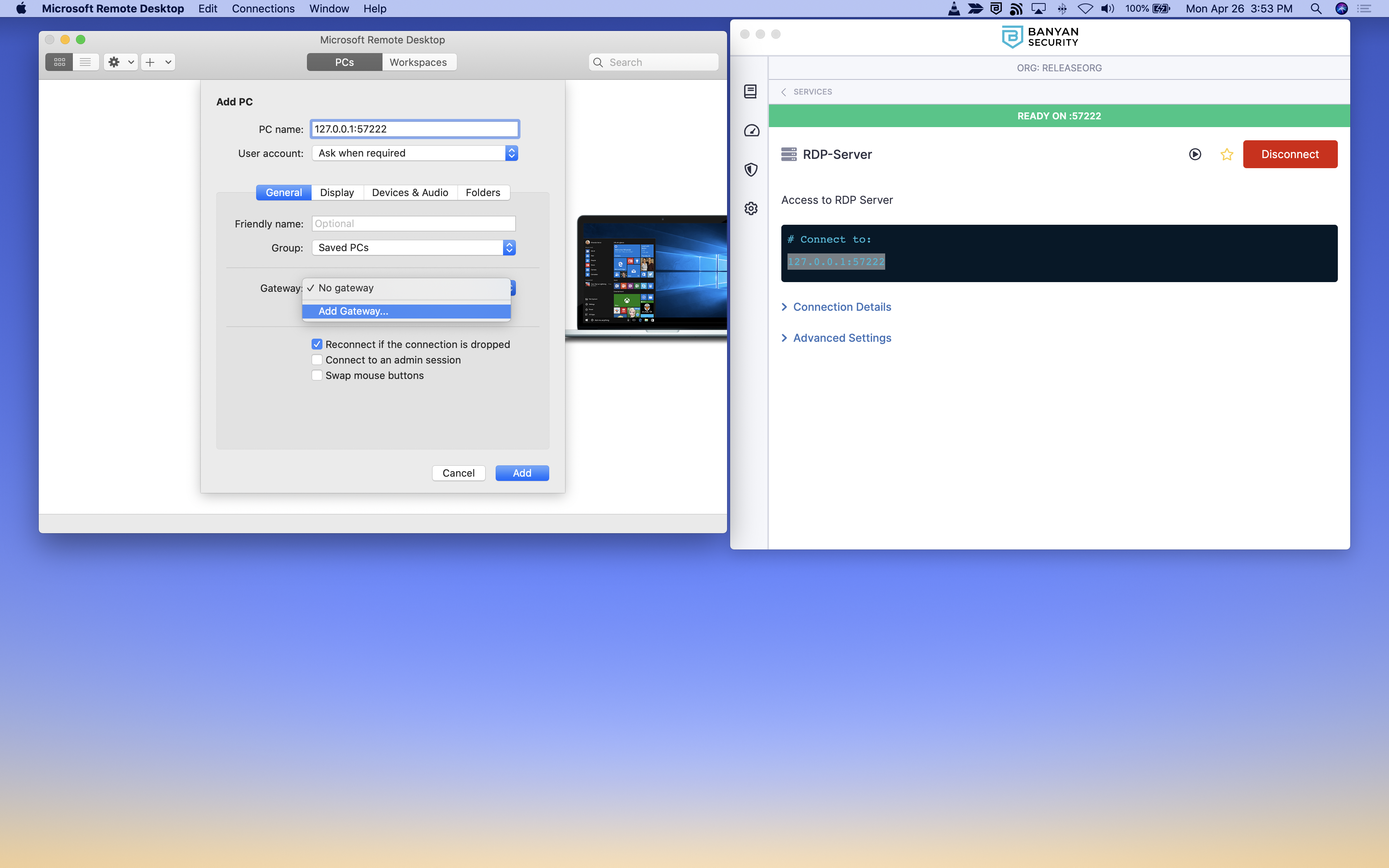 In the desktop app, the end user selects Connect, which runs banyanproxy in a special RD Gateway mode. The user has to update their Remote Desktop client’s RD Gateway configuration to point to this banyanproxy.