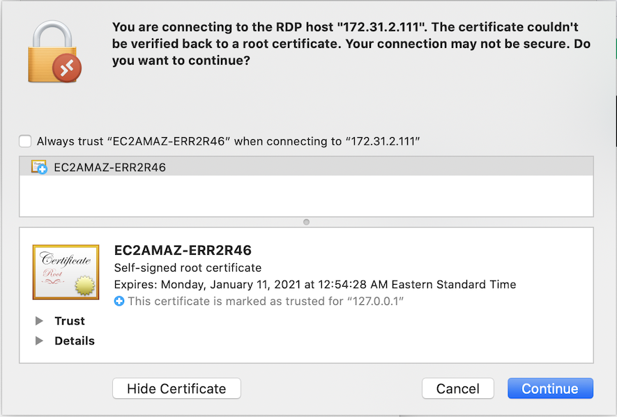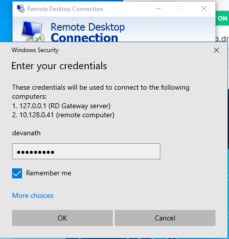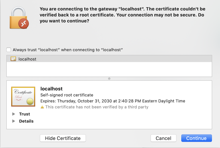 8. You will be prompted to accept certificates for the RD Gateway and Client.