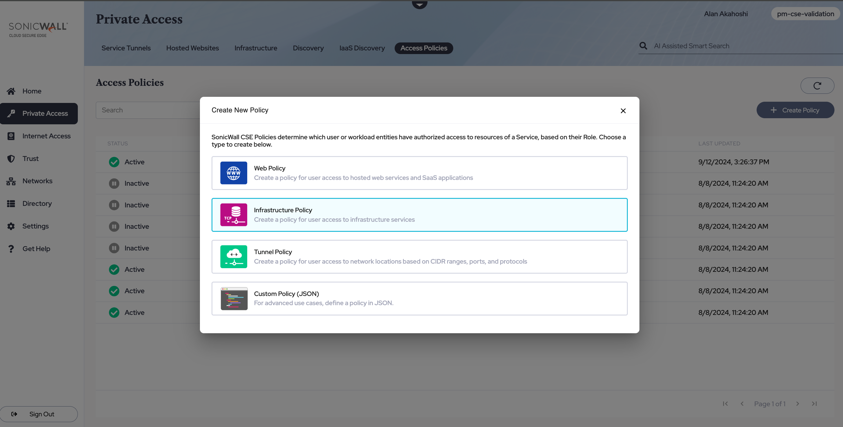 Navigate from Private Access > Access Policies, and then select + Create Policy. Select the Infrastructure Policy template.