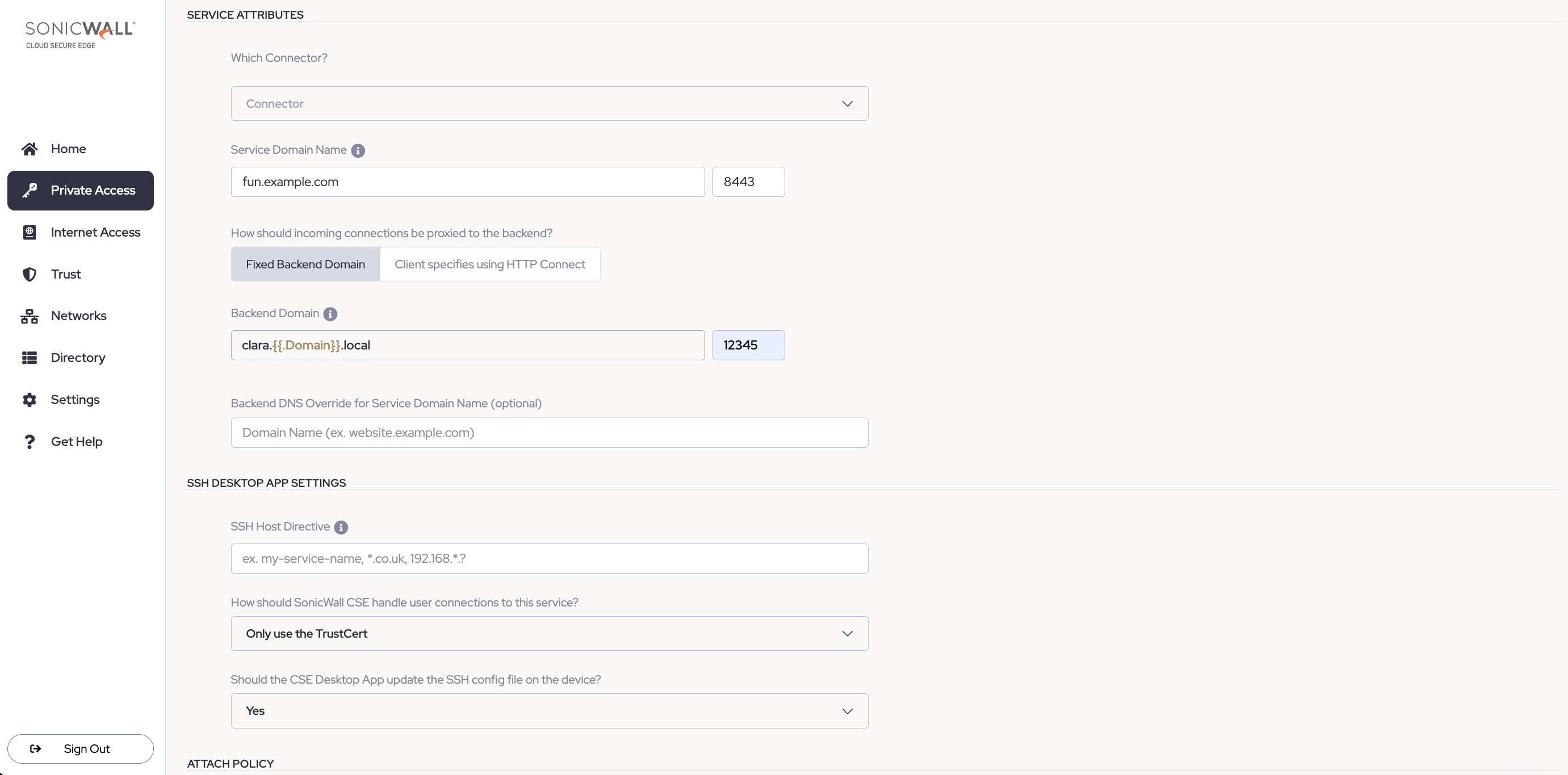 3.8 Enter the Backend Domain of the SSH server you want to secure access to. If you want to configure a backend domain that leverages User Attributes, enter two curly brackets, and a dropdown menu will appear, with various user attribute options to select from.