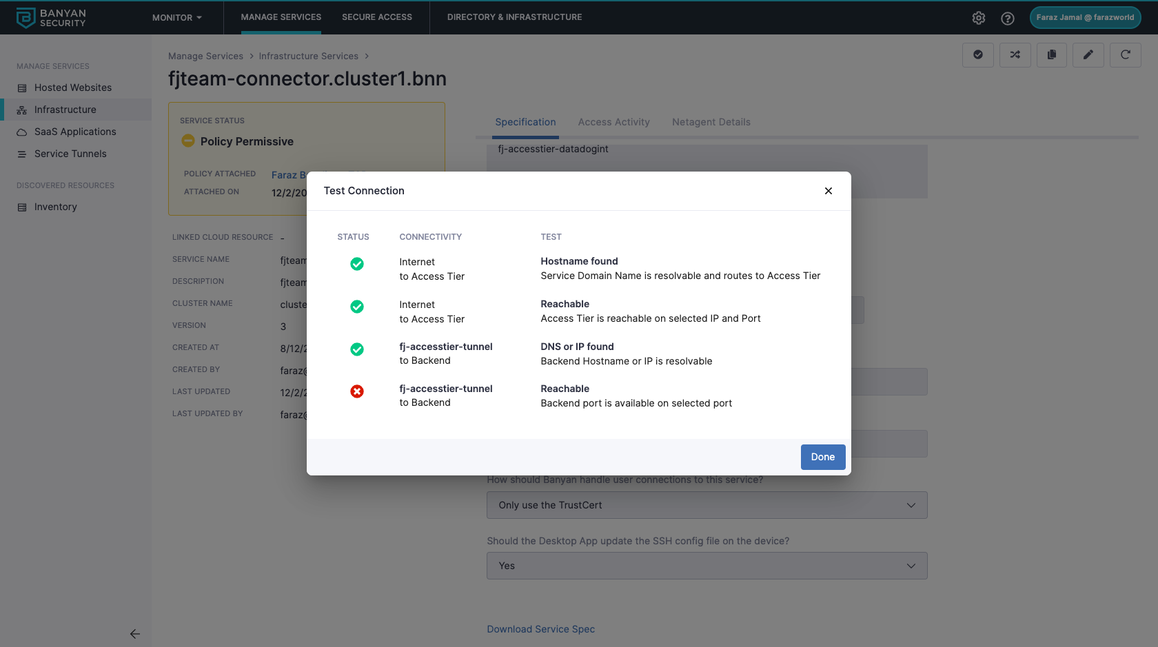 In the Command Center, navigate from Private Access > Infrastructure, then select a Service Name. In your service, select Test Connection (the check icon in the upper right corner of the page). This will show you the status of your connection, detailing whether your domain name or hostname are resolvable and whether the Access Tier and backend port are reachable.