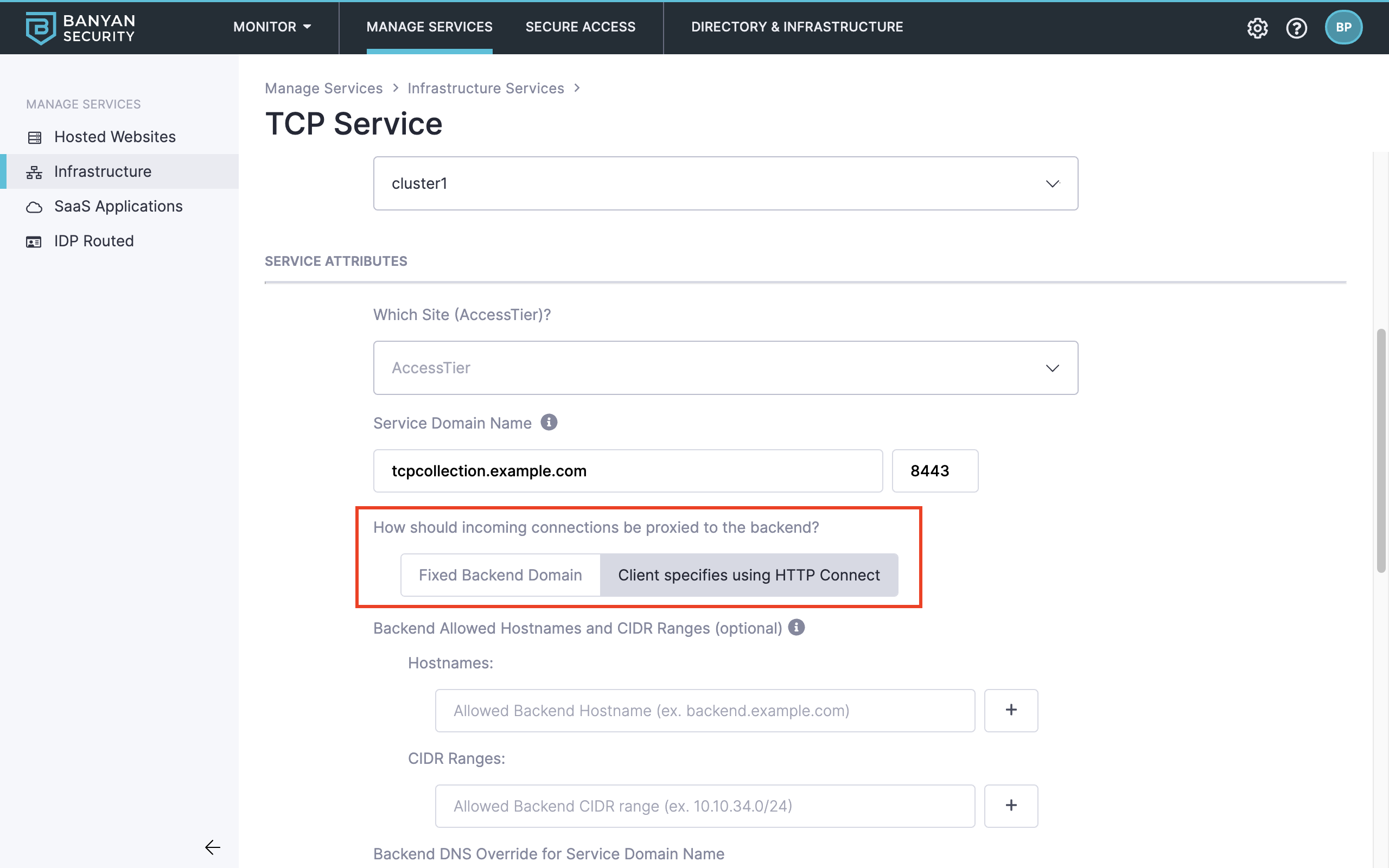2. On the service registration page, configure all applicable fields and set the method for how incoming connection should be proxied to the backend to Client specified using HTTP Connect.