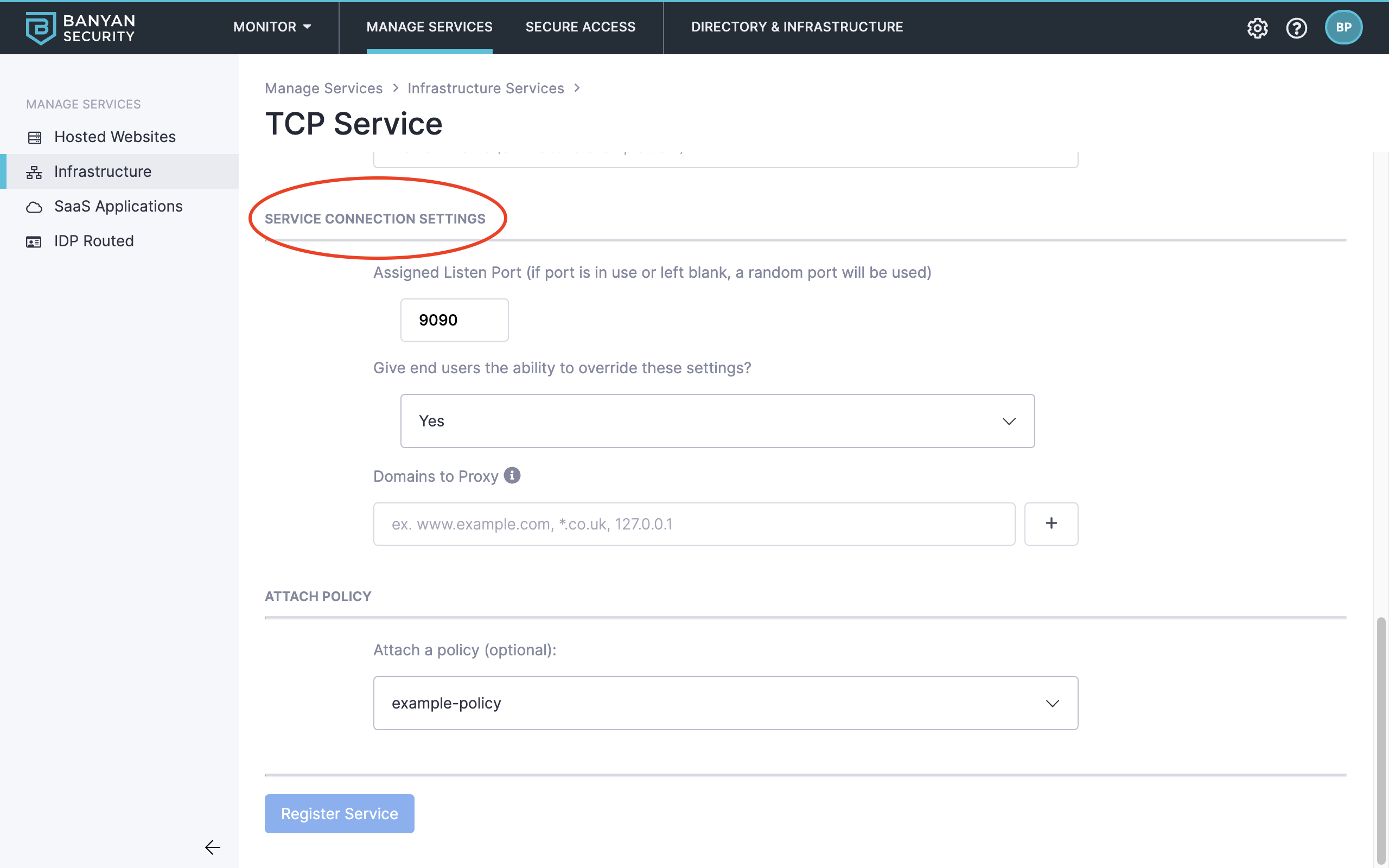 1. Navigate to Private Access > Infrastructure and select + Register Service. Select the option Other TCP Service.