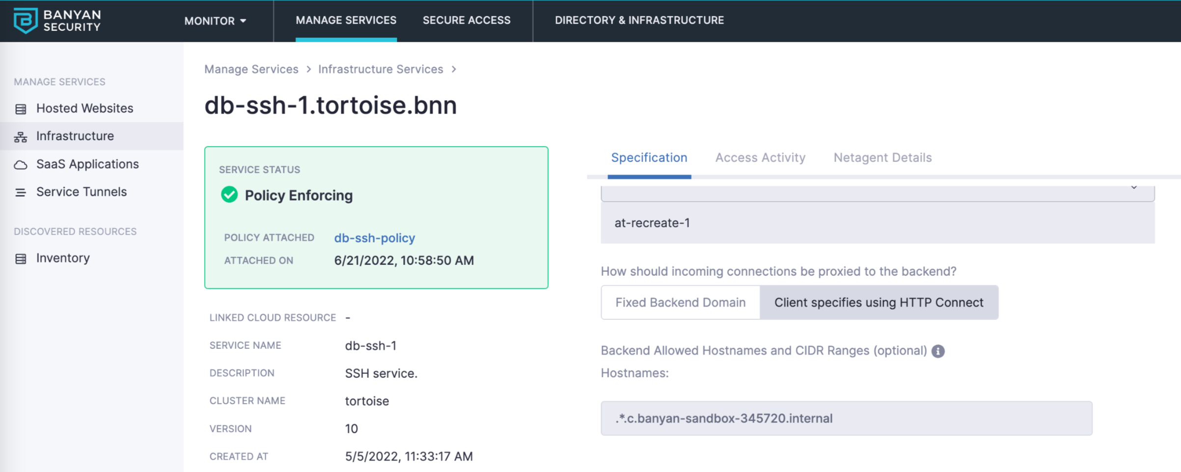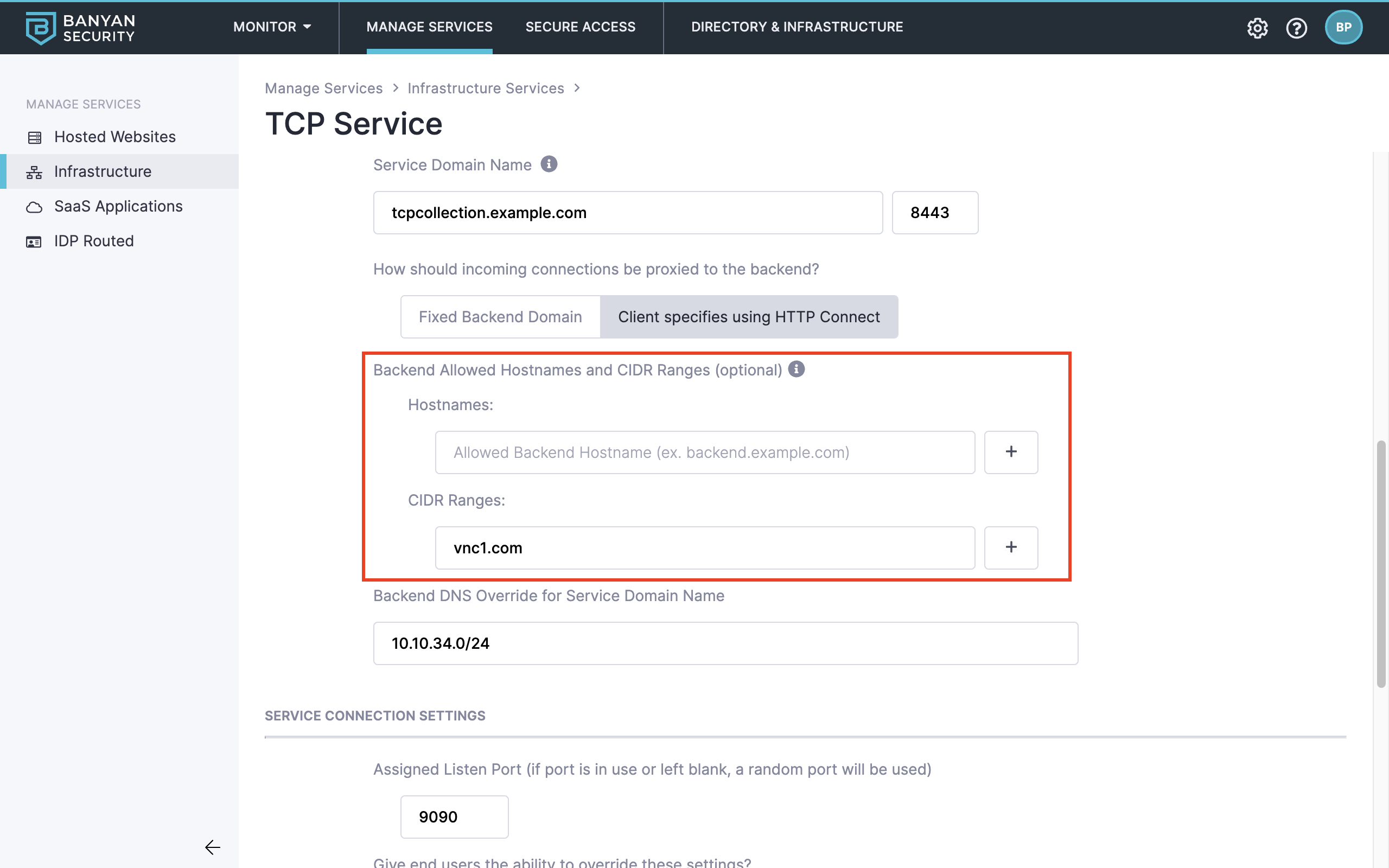 For simple use cases, you can restrict backend connectivity to the specified hostnames or CIDR ranges when configuring a collection of TCP services. In the example below, connections are allowed only if the service destination has the hostname vnc1.com and is in the CIDR range 10.10.34.0/24.