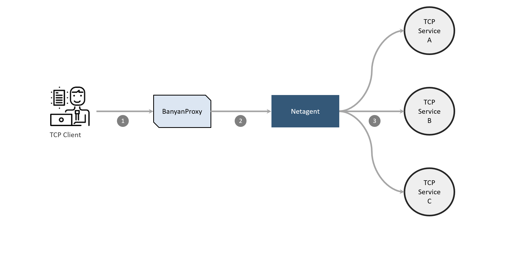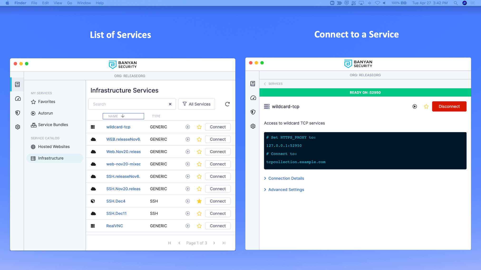 In the desktop app, the end user clicks Connect on the service to start banyanproxy in HTTP Connect mode, listening on a specific port. The end user also configures their TCP client with the application-specific setting or environment variable to connect to the banyanproxy using HTTP Connect proxy.