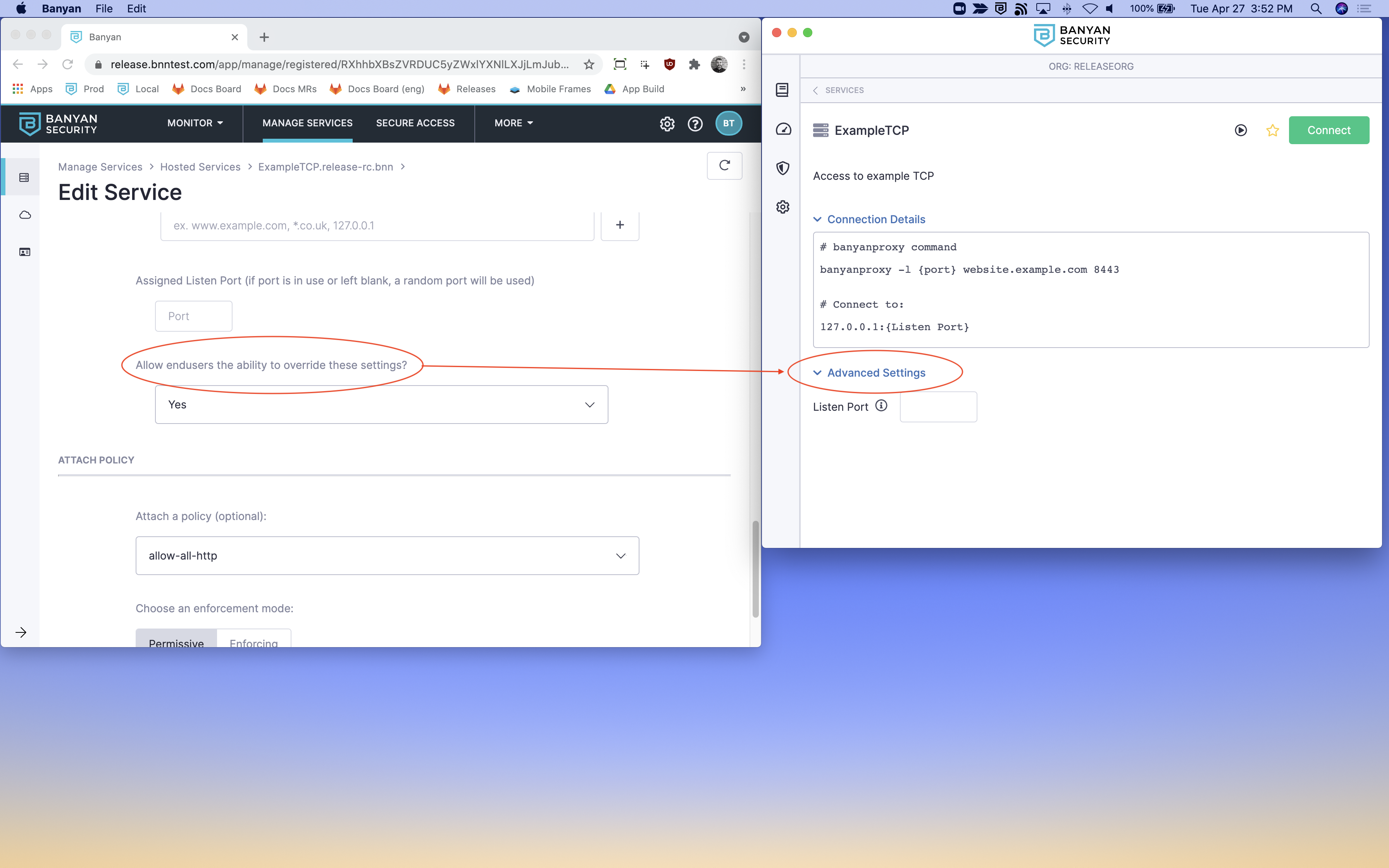 When the user clicks Connect in the Desktop App, the banyanproxy will launch in TCP Mode, on some user-specified listen port (such as 8081).