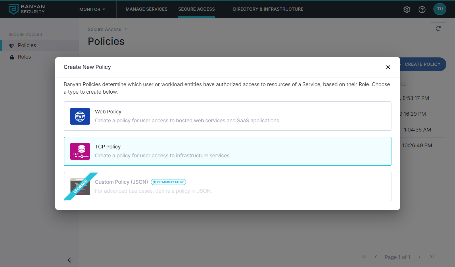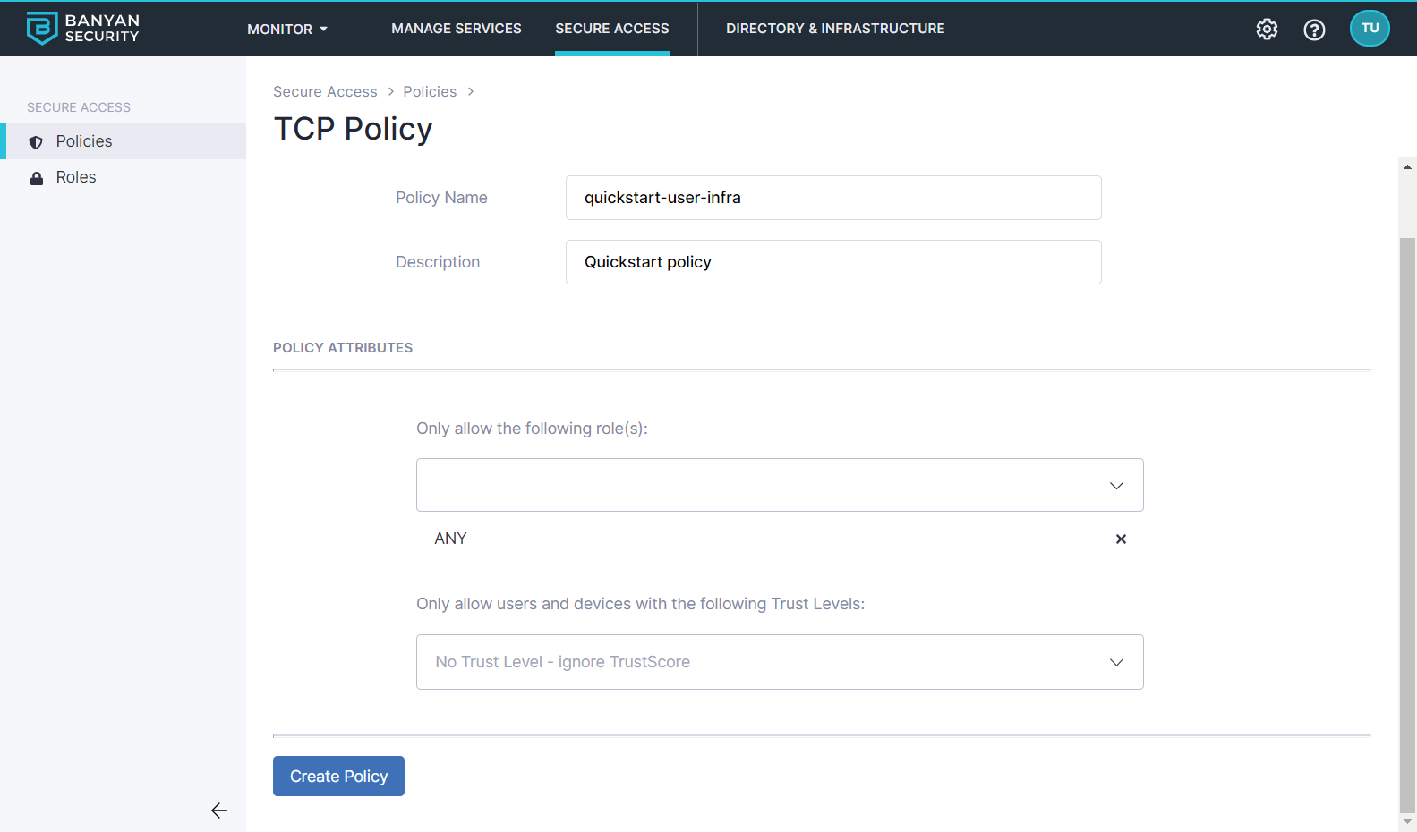1.1 Log into the Command Center and navigate from Private Access > Access Policies > + Create Policy.