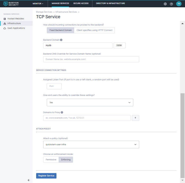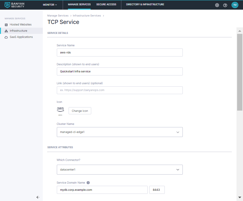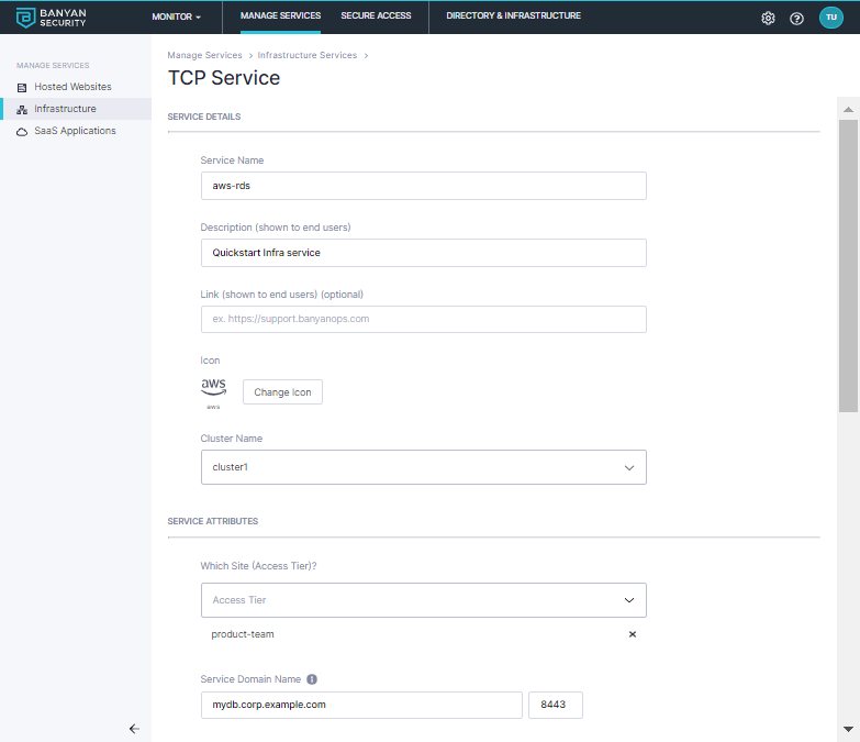 mydb.corp.example.comand leave the port as8443; the Banyan app will connect to this domain to set up an MTLS tunnel so users can access the service