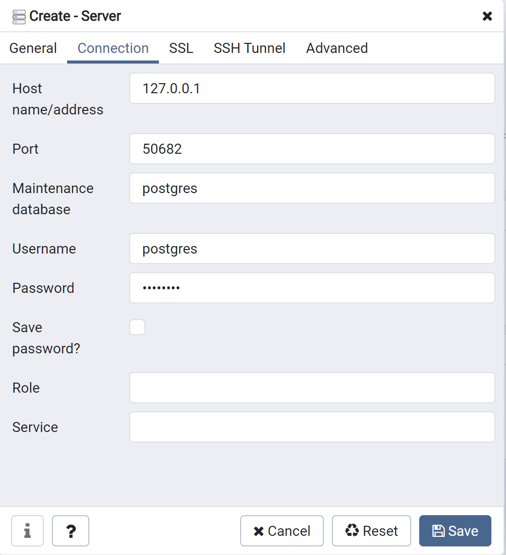 3.3 Launch your preferred database management tool (such as Microsoft SQL Server Management Studio, pgAdmin, phpMyAdmin, MySQL Workbench, etc.), and then create a new server using the localhost:port noted in the previous step. If necessary, enter your credentials to authenticate.