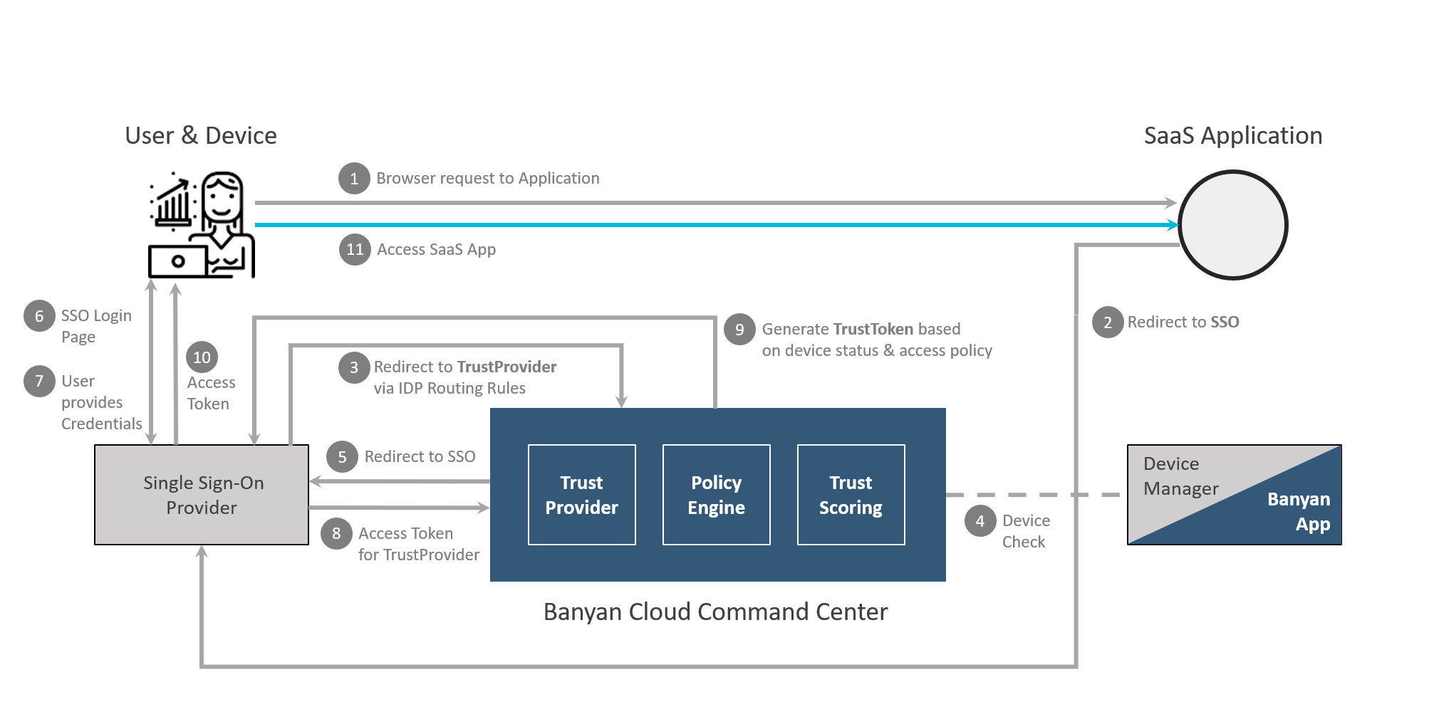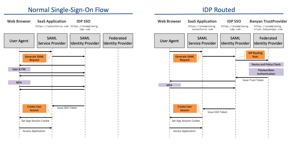 This topic details IDP Routed authetication to secure your SaaS apps; in this technique, the SaaS Application is configured for SAML/OIDC authentication using your Identity Provider and your Identity Provider is configured to federate to Banyan’s TrustProvider component. Zero Trust policies are defined for groups of SaaS applications you route via IDP Federation logic. You can also configure CSE-federated authentication to secure your SaaS apps.