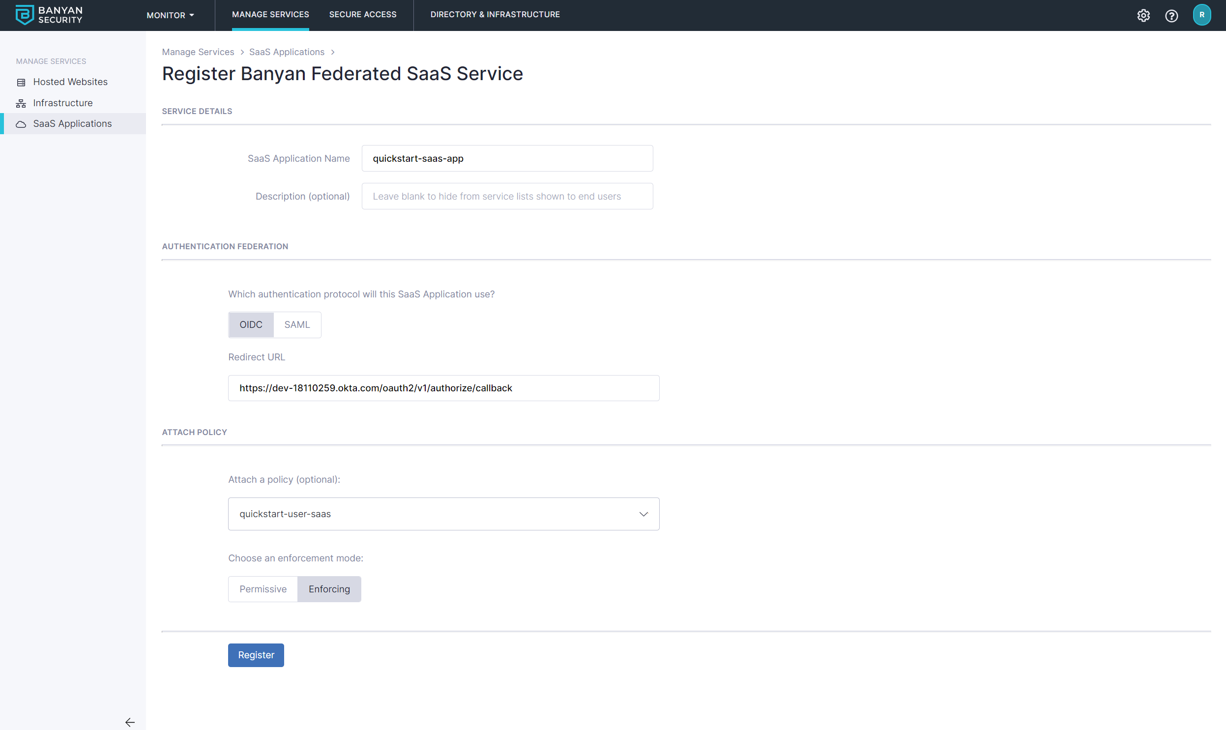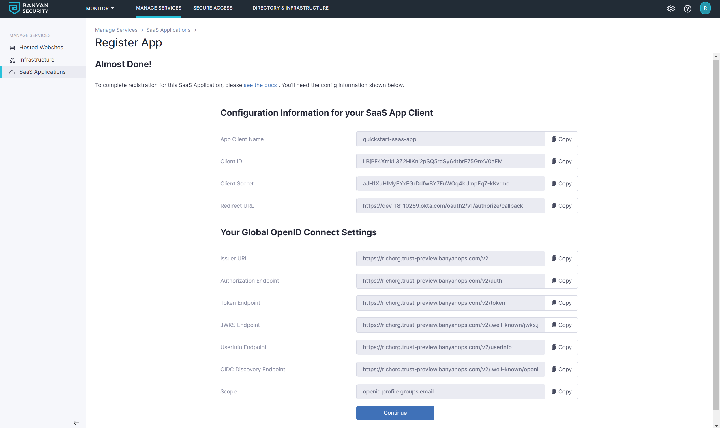 2.5 Select Register. The next screen will give you the details you need to enter into your SaaS app.