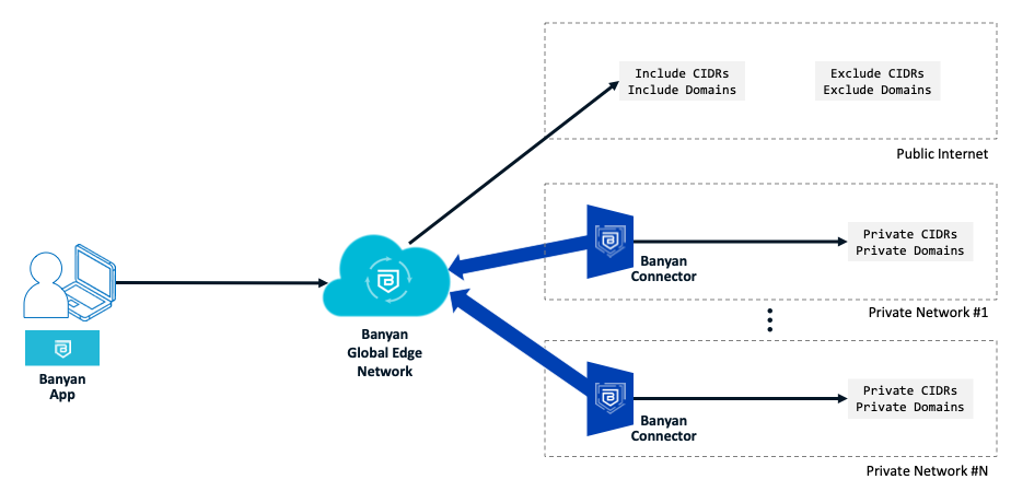 For Global Edge deployments, traffic to Public CIDRs and Public Domains flows through the Global Edge Network.