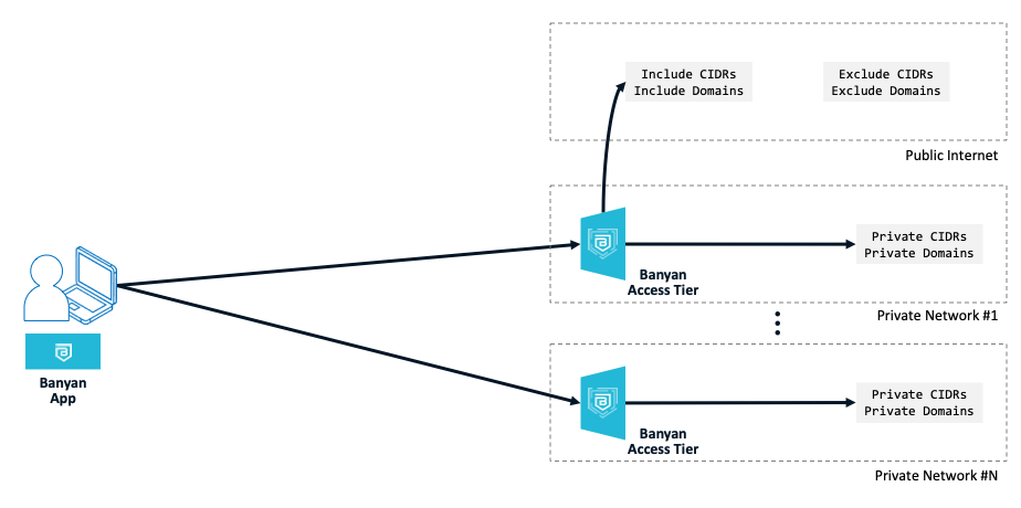 For Self-hosted Private Edge deployments, traffic to Public CIDRs and Public Domains flows through a selected Access Tier(s).